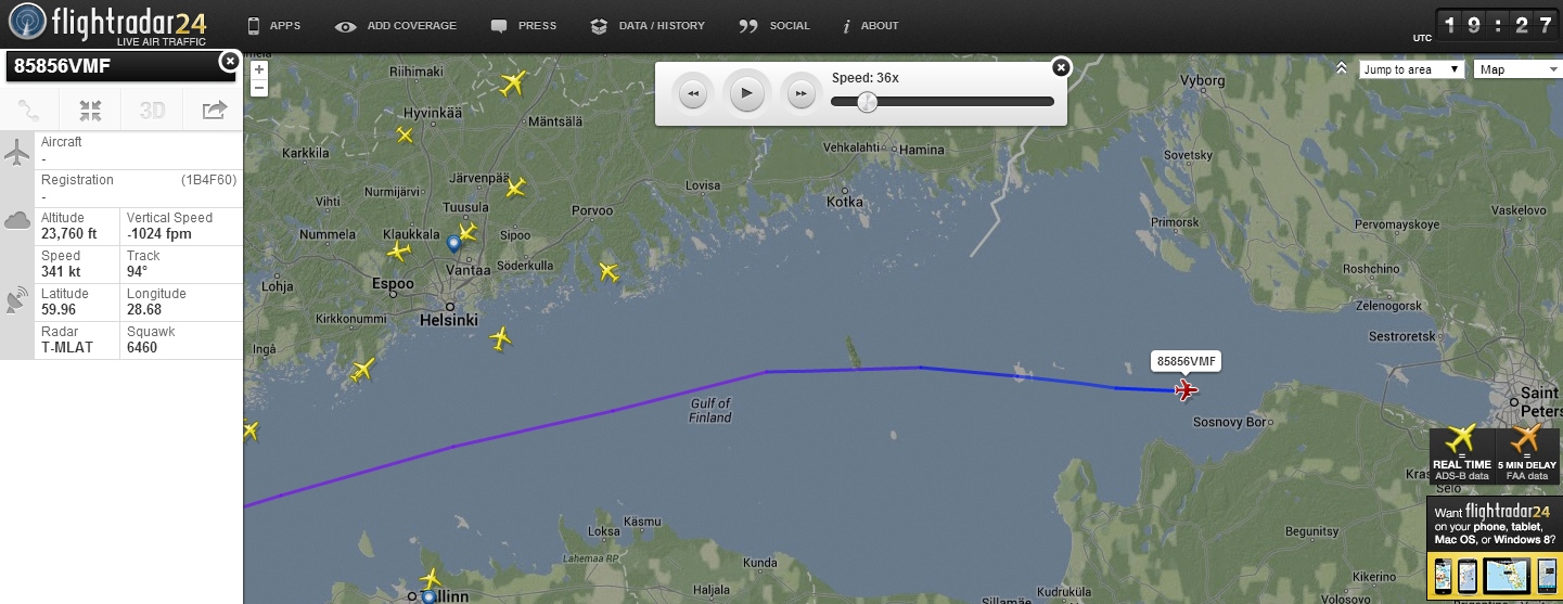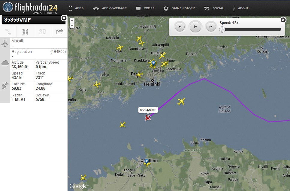 Kone ei itse lähettänyt sijaintiaan useimpien liikennekoneiden tapaan tarkkana ADS-B-datana (Automatic Dependent Surveillance-Broadcast). Reitit perustuivat kummallakin kerralla FlightRadar24:n epätarkempaan T-MLAT-laskentaan (Test Multilateration) ilma-aluksen transponderin lähettämien signaaleiden perusteella. YLE kertoo, että Porvoon seudulla kuultiin laajalla alueella tiistai-iltana kello 22.15 ylisoonisella nopeudella lentäneen F/A-18 Hornet -suihkuhävittäjän perässään vetämä ja maassa olijoille pamauksena tuntuva shokkiaalto. Äänihavainnot viittannevat siihen, että Ilmavoimat mahdollisesti kävi tunnistamassa 85856VMF:n myös sen paluulegillä kello 22? Ilmavoimat ei lennä maa-alueiden yläpuolella ääntä nopeammin kuin pakottavissa operatiivisissa tehtävissä. Suomenlahdella on suhteellisen kapea kansainvälinen ilmatila. Venäläiset lentävät Itämeren yllä mm. huoltolentoja Liettuan ja Puolan välissä olevaan Kaliningradin enklaavin tukikohtaansa. Itämeren yllä kansainvälisessä ilmatilassa lentää jatkuvasti myös eri valtioiden signaalitiedustelukoneita ja muita sotilasilma-aluksia. ++ Lue myös: