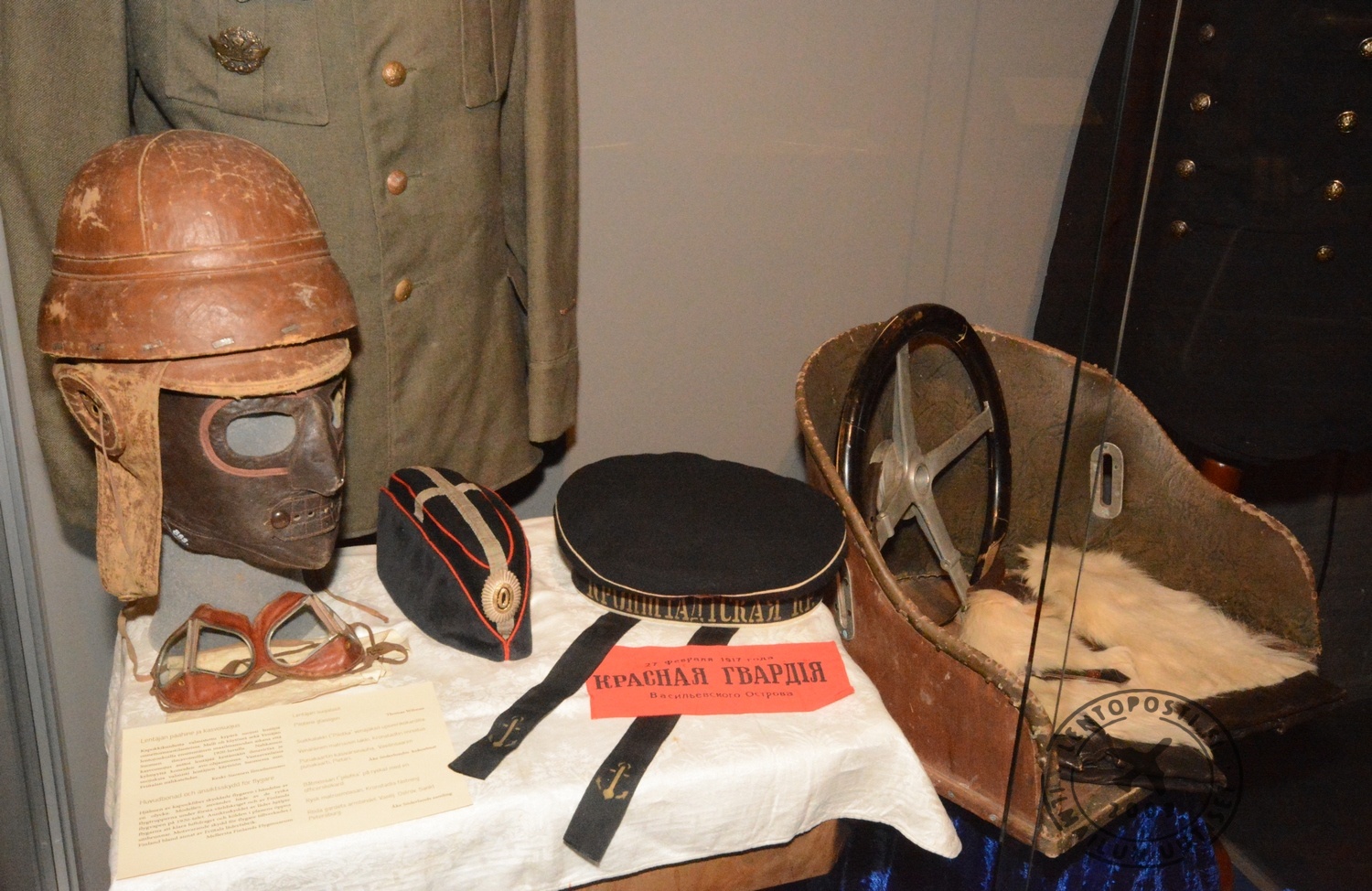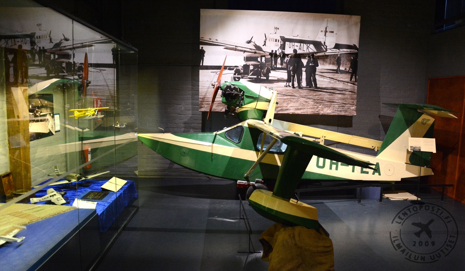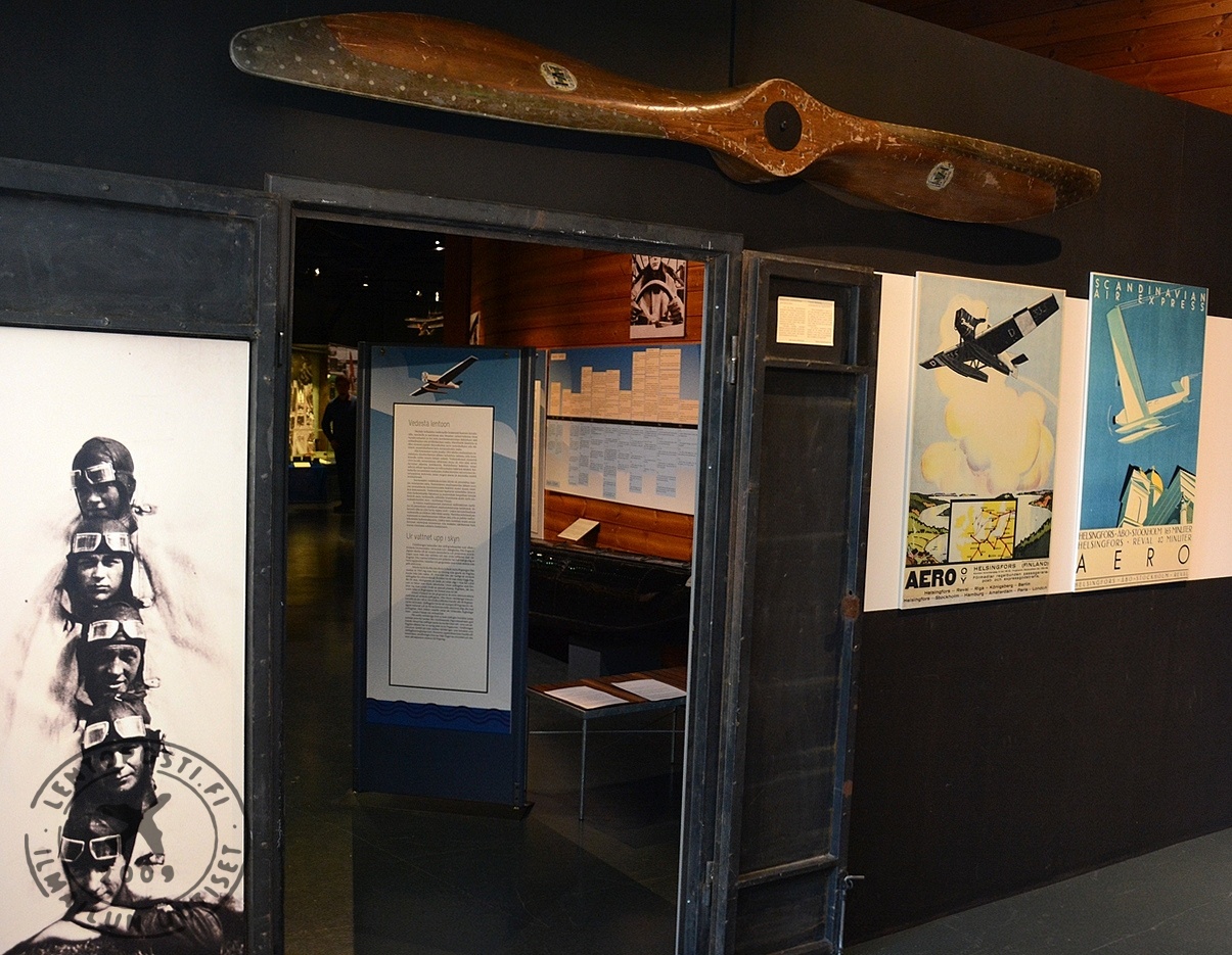 Vedestä lentoon -näyttelyyn saavutaan suomalaisvalmisteisen I.V.L. A.22 Hansa -koneen puupotkurin alta kävelemällä (klikkaa kuvat suuremmaksi). Hämärästi valaistussa hallissa esineet on nykytyyliin nostettu esiin kohdevaloilla. Tämä järjestely hieman haittaa monipuolisten selitetekstien lukemista.