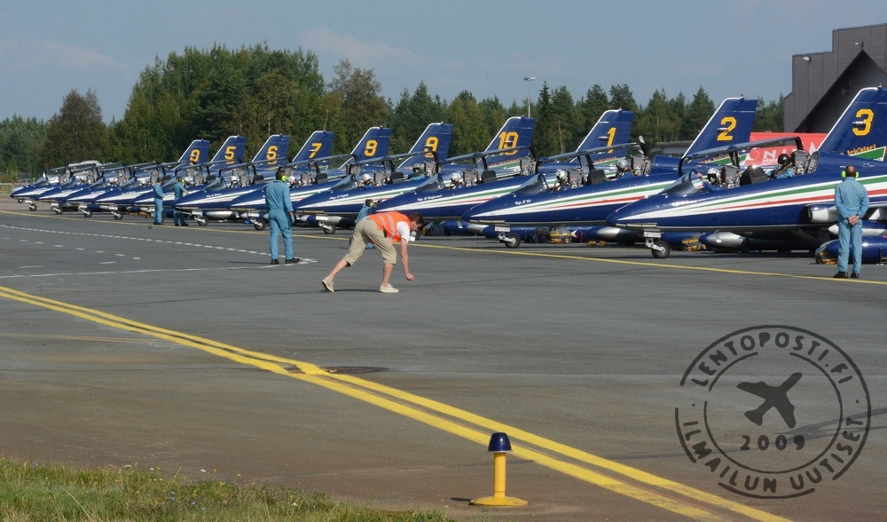 Taivaalla nähtiin myös tähtimoottorikone Texan. Molemmat koneet omistaa Suomessa nykyisin asuva Phil Lawton. Järjestäjä ei ole vielä kertonut tarkkaa yleisömäärä, mutta mediassa ja netissä julkaistujen kuvien perusteella väkeä on ollut paljon. Tämä aiheutti Kalevan lukijakommenttien mukaan pitkä jonoja palvelupisteisiin ja vessoihin. Lähes yhtä perinteiseen tapaan lentonäytöksen poistumisliikenne ruuhkautui pahoin. Näitä ilmiöitä ei yksinkertaisesti voi välttää suurissa yleisötapahtumissa. Etenkin omilla autoillaan liikkuvat seisoivat pitkään tilapäisten pysäköintialueiden ruuhkissa. Tilanteelle ei voi mitään: Oulunsalon lentokenttä on yhden pääväylän päässä. Niinpä myös monien lentomatkustajien siirtymiset viivästyivät. Samaten näytöksen bussikuljetukset kärsivät ruuhkasta. Finavia oli varottanut ruuhkista etukäteen tiedotteessaan. ++ Kuva Frecce Tricolorin värillisistä savuista Twitterissä: @terhiainen Video Frecce Tricolorin lauantain esityksestä: YouTube Uutinen lauantain lentonäytöksestä: Kaleva Lue Lentoposti.fi:stä mitä muuta sunnuntain näytöksessä on odotettavissa: Oulussa perjantaina näyttävät harjoitukset