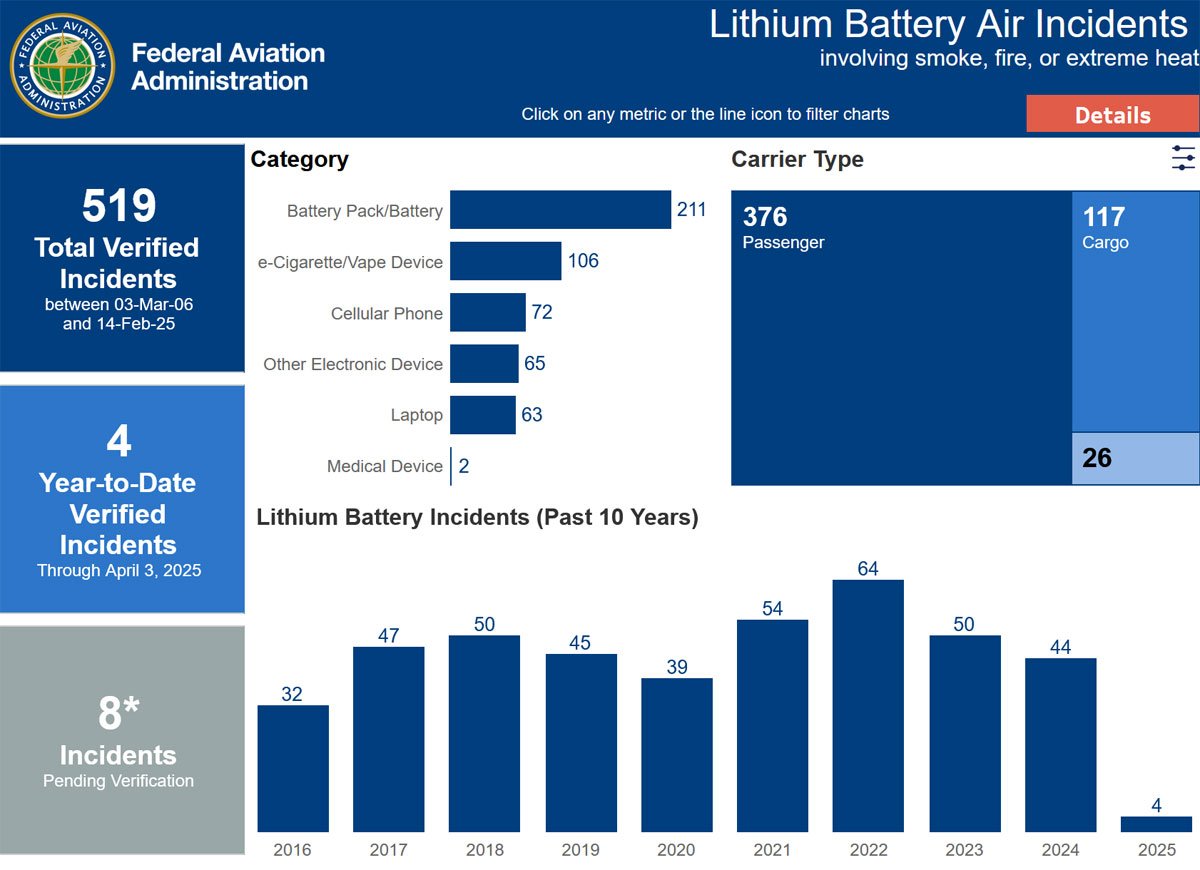 Yhdysvalloissa tapahtui vuoden 2024 aikana 44 tapausta, joissa laitteen akku ylikuumeni, savusi tai syttyi tuleen lennolla. Kuluvan vuoden aikana tapauksia on jo neljä. Tapauksista valtaosa koski varavirtalähteitä ja toiseksi suurin osuus oli sähkötupakoilla.