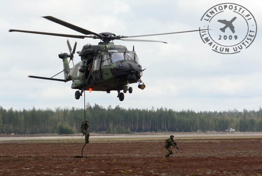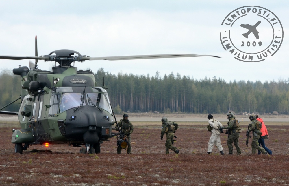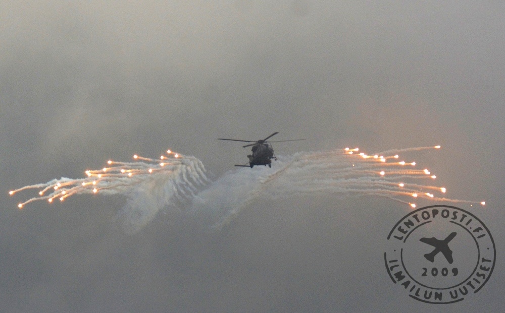 Kopterien saapuessa noutamaan joukkoja toinen niistä käytti lämpöhakuisten ohjusten harhauttamiseen tarkoitettuja kuumina hehkuvia soihtuja. Operaatio tapahtui kaukana yleisöstä ja lähes pilven sisällä, mutta silti näky oli vaikuttava (otsikkokuvassa). Kyseessä oli NH90-kopterin ensimmäinen soihdutus yleisölle avoimessa lentonäytöksessä. Maanäyttelyssä oli esitteillä uusin NH90-koneyksilö NH-220 peräramppi avattuna. Toisessa kopterissa (NH-213) oli näytteillä oviaseena käytettävä Gatling-periaatteella toimiva Dillon Aero M-134D-H Minigun -konekivääri.