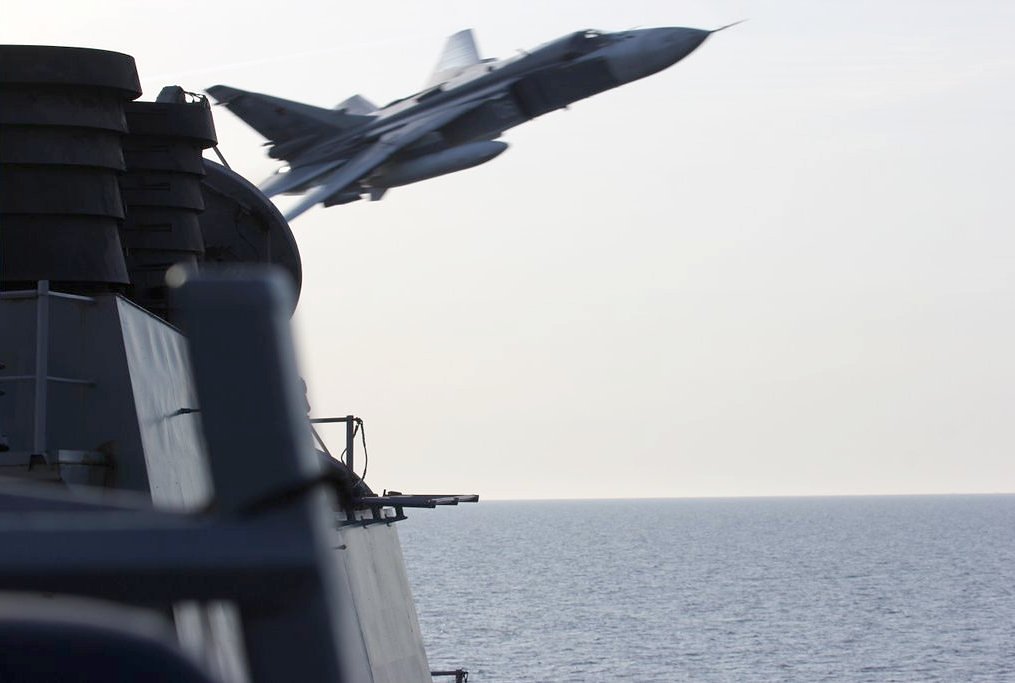 Arleigh Burke -luokan ohjushävittäjä USS Donald Cookin komentosillalta perän suuntaan otetussa kuvassa (yllä) näkyy vasemmalla aluksen taaempi savupiippu. Sukhoi Su-24M -pommikone kaartaa takaviistosta Cookin ohi sen vasemman kyljen puolelta. Vaikka huomioitaisiin mahdollinen teleobjektiivin aiheuttama etäisyyksien tiivistyminen kuvassa, venäläiskone ohitti risteilijän poikkeuksellisen läheltä. Lentokorkeudeksi on uutislähteissä mainittu 30 jalkaa eli vain noin 10 metriä. Kääntyväsiipinen Su-24M näyttäisi US Navyn julkaisemassa kuvassa lentävän kaarrossa siivet keskiasennossa. Suurella nopeudella lennettäessä siivet on taitettu taakse tiukkaan nuolimuotoon, hidaslennossa kuten laskun aikana ne ovat puolestaan etuasennossa. Kuormana koneen siiven tyven kiinteissä ripustimissa on kaksi suurta lisäpolttoainesäiliötä. Kuvan perusteella mukana ei näyttäisi olevan ulkoista asekuormaa. Jutun lopussa olevassa videossa kaksi Su-24M-konetta ohittaa matalalennossa USS Donald Cookin sen kummaltakin puolelta. Ääniraidan perusteella ainakin toinen lentää aluksen komentosillan tason alapuolella. Otsikkokuva on otettu eri tilanteesta. Koneet tekivät ilmeisesti 11 ohilentoa. Myös venäläinen Kamov Ka-27 -meritoimintahelikopteri kiersi hävittäjän seitsemän kertaa. Tapaukset sattuivat 11. ja 12. huhtikuuta kansainvälisellä merialueella eteläisellä Itämerellä runsaan 100 kilometrin päässä Venäjälle kuuluvan Kaliningradin enklaavin rannikosta. Kaliningrad sijaitsee Liettuan ja Puolan välissä.