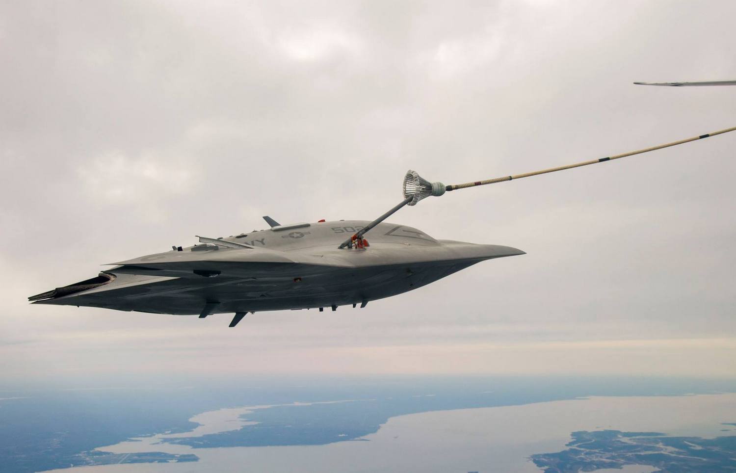 Miehittämätön X-47B (SaltyDog 502) ohjasi iltapäivällä 15. huhtikuuta Chesapeake-lahden yllä itsenäisesti tankkauspuominsa Omega Aerial Refueling Services -yhtiön Boeing K-707 -koneen vetämän tankkausletkun koriin. UACS:n puomin lentäminen tarkasti tankkausletkun koriin onnistui Differential GPS:n ja optisten sensorien avulla.