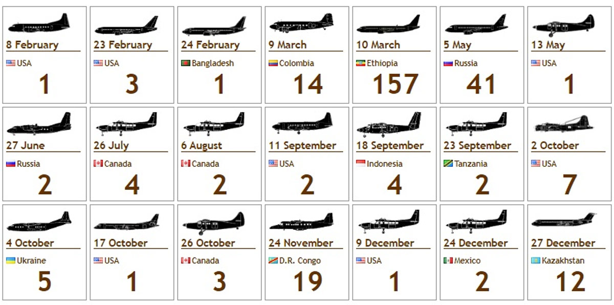 Vuoden 2019 viimeinen lento-onnettomuus tapahtui Kazakstanissa 27. joulukuuta, kun Bek Airin Fokker 100 -matkustajakone putosi maahan pian lentoonlähdön jälkeen. Turmassa menehtyi 12 ihmistä. Suurin lento-onnettomuudessa menetetty konetyyppi vuoden 2019 aikana oli Prime Airin Boeing 767-300ER (BCF) -rahtikone. Sen maahansyöksyssä menehtyi kolme ihmistä. Moni lentoturmista tapahtui myös historiallisille matkustajakoneille. Helmikuussa yksi menehtyi vuonna 1955 valmistuneen Convair C-131B Samaritan -koneen turmassa Yhdysvalloissa.