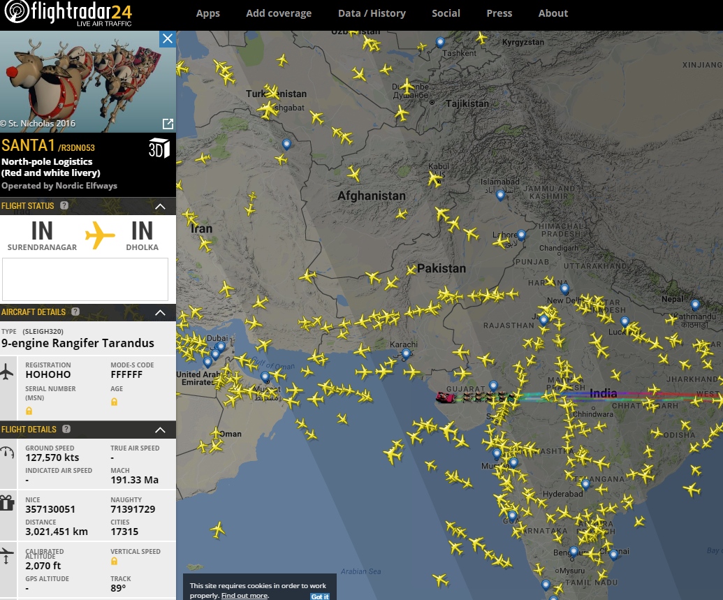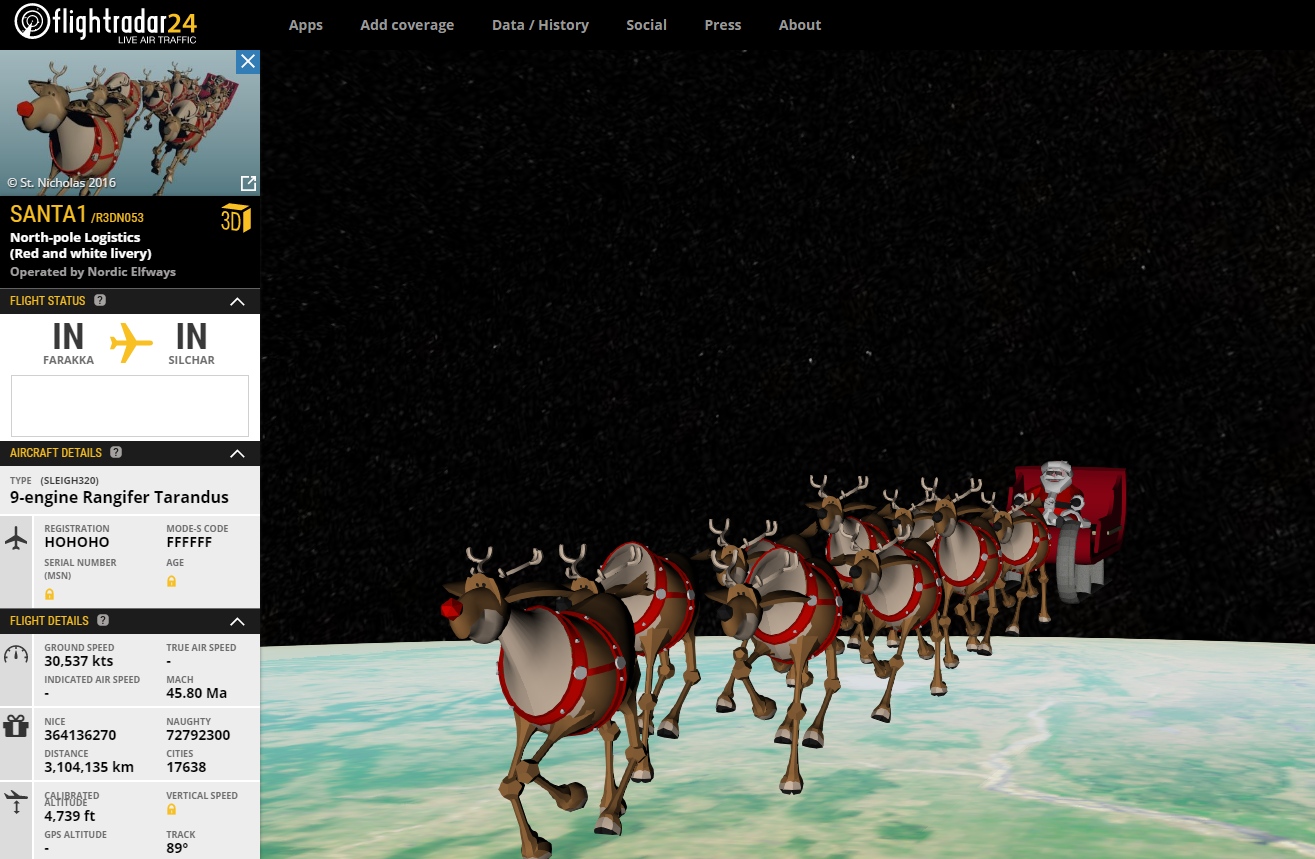 Flightradar24 näyttää miten Santa1 -tunnuksella varustettu Nordic Elfwaysin operoima Sleigh320 -ilma-alus etenee aattoiltana North-pole Logistics -yhtiön lahjanjakeluverkostossa yhdeksän Rangifier Tarandus -voimanlähteen vetämänä.