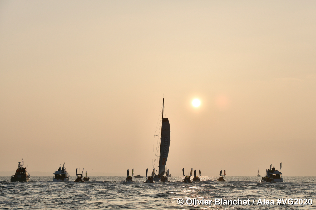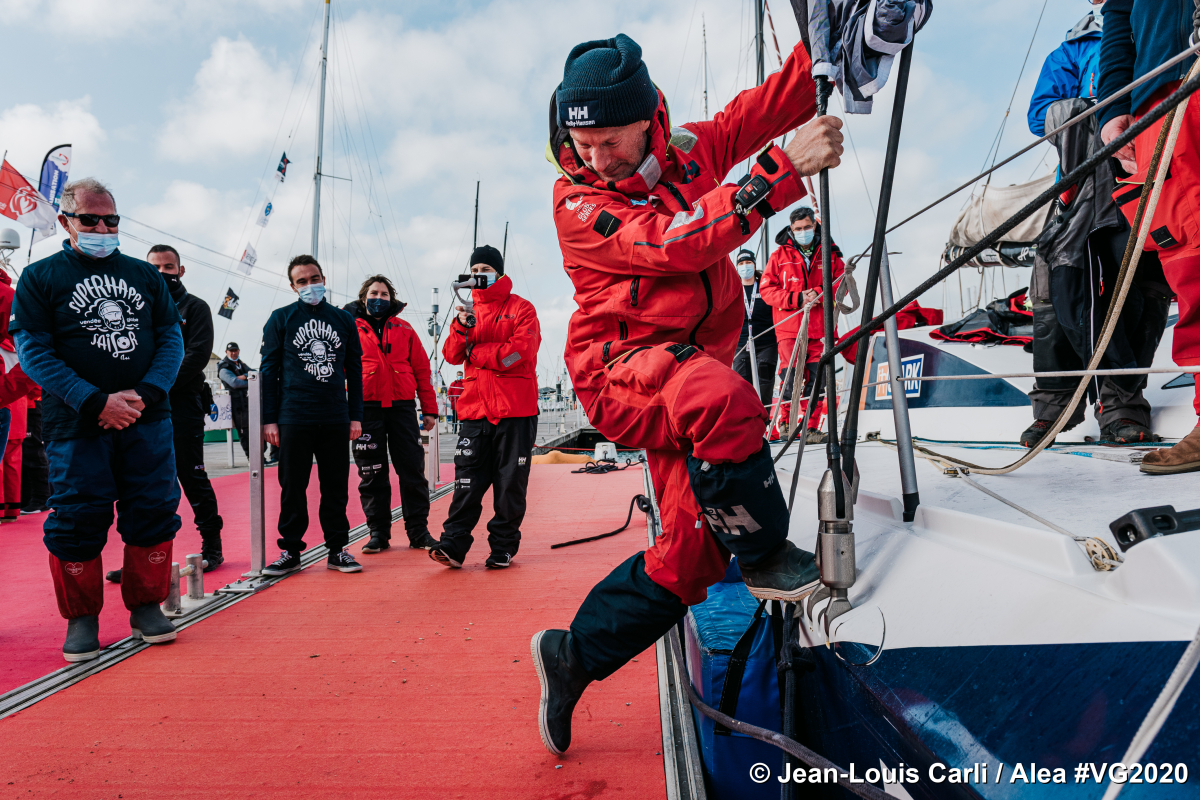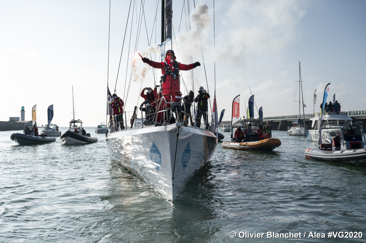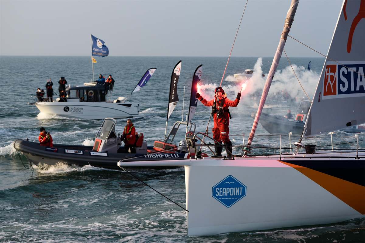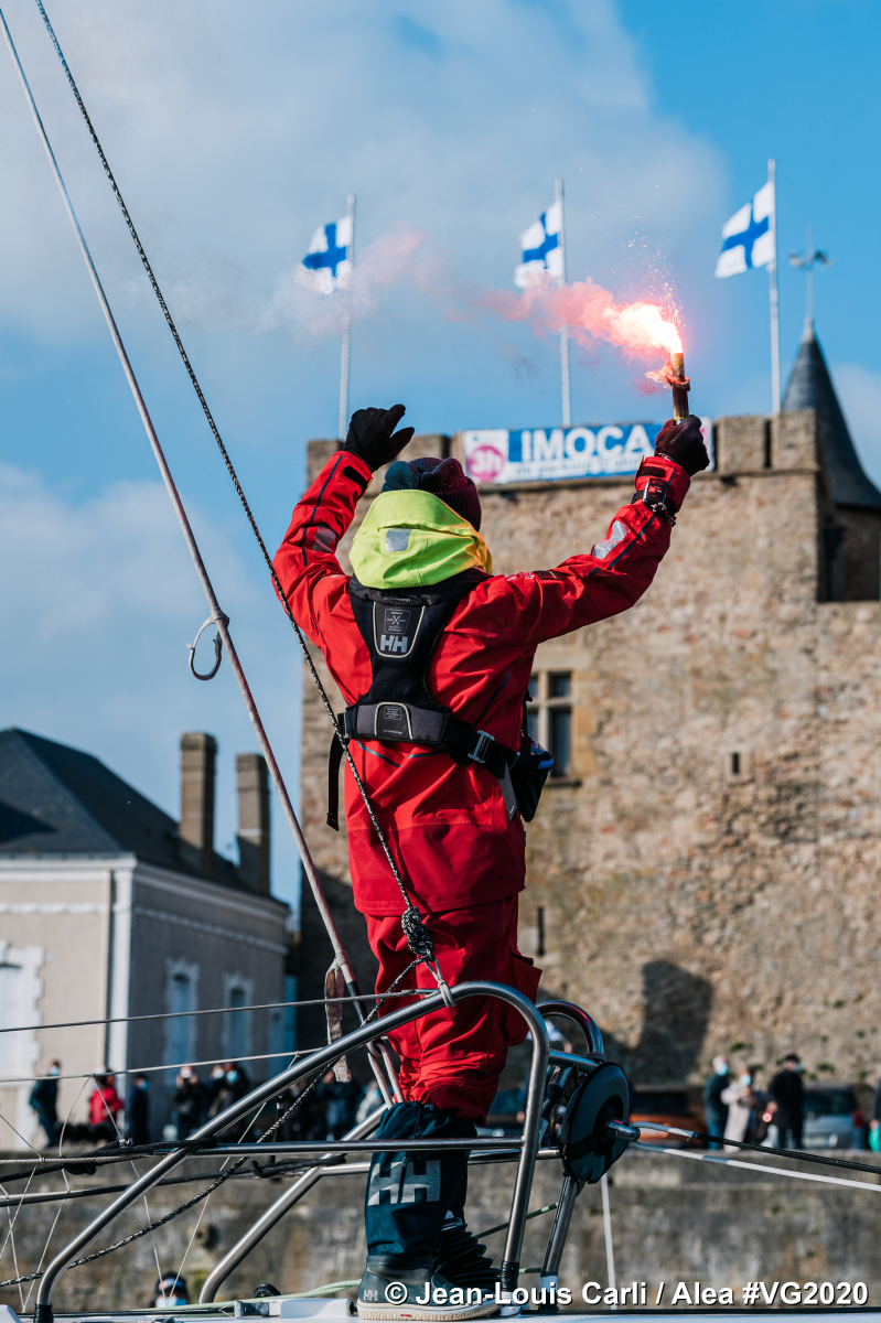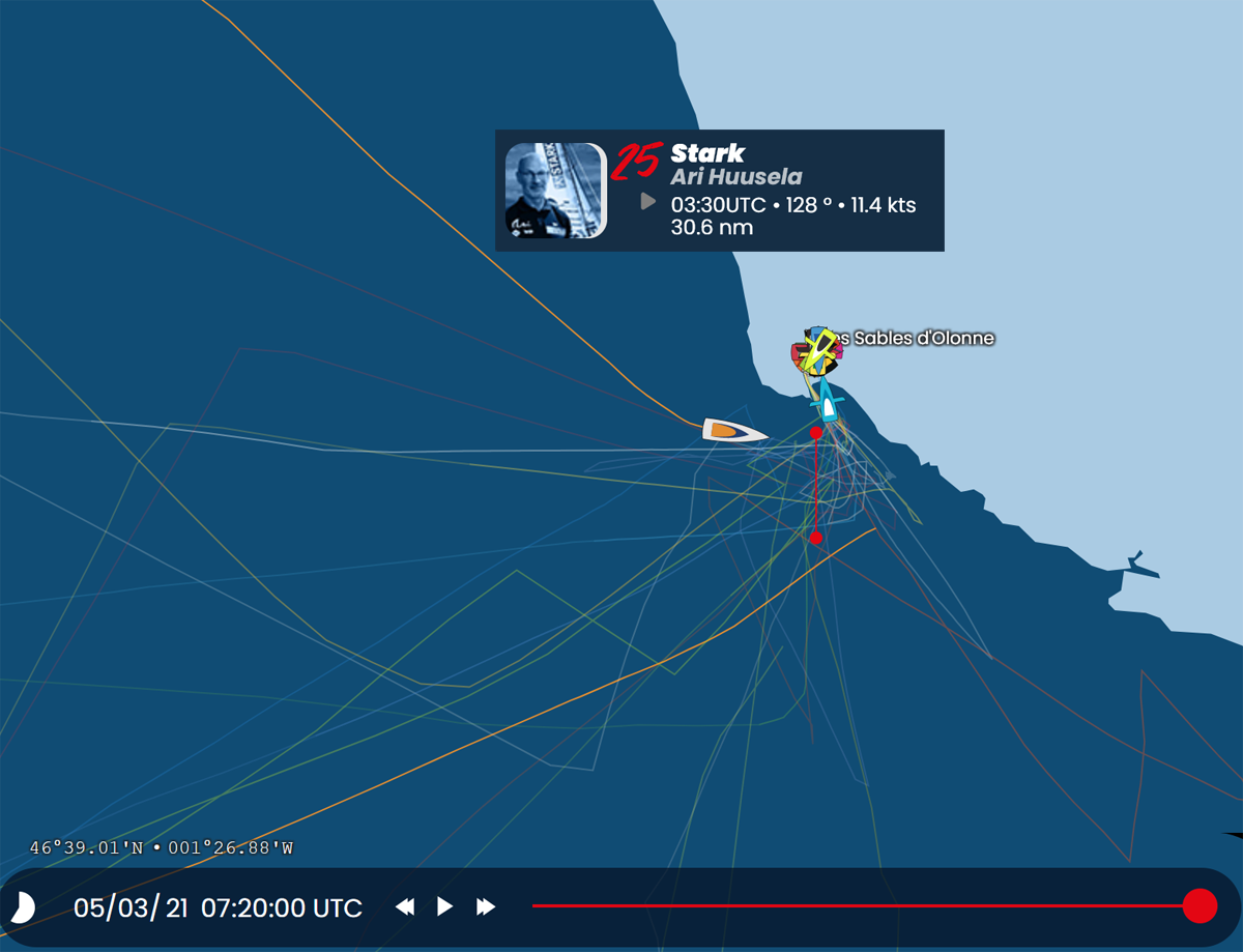 Huuselan ja Stark-veneen saapuessa satamaan oli saattoveneinä ensin kaksi RIB-venettä (rigid inflatable boat), sitten neljä ja pian jo kuusi. Lopulta lukumäärä kasvoi 20 ennen rantautumista. Kyseessä oli todellinen tungos verrattuna siihen, että edellisen 116 vuorokauden aikana havaintoja muista veneistä ei käytännössä ollut ja maastakin havaintoja oli ollut vain kolmesti. Niistä ensimmäinen Antipodisaarilla Uuden-Seelannin eteläpuolella, sitten Kaphornilla ja viimeisenä Azoreilla, jossa Huusela pääsi kiinni myös yhteen pieneen, mutta tärkeään tavoitteeseensa eli matkapuhelinverkkoon. Verkkovierailun aikana Huusela latasi uutta musiikkia matkassa olleiden 23 kappaleen lisäksi. Suunniteltua pienemmäksi musiikkimäärä jäi, koska kaikki ladatut kappaleet eivät toimineetkaan offline-tilassa. Kolmen kuukauden verran käytössä ollut soittolista sai siis väistyä loppumatkalle tuoreemman materiaalin tieltä. Samalla Huusela päivitti maailmantilannetta seuraamalla uutisvirtaa. Huuselan saapuminen Les Sables d’Olonneen perjantaina 5. maaliskuuta oli samalla koko vuoden 2020 Vendée Globe -yksinpurjehduskilpailun päätös, joka toi tilaisuudelle merkittävää lisäarvoa. Lentoposti.fi tavoitti Huuselan sunnuntaisen aamukahvihetken aikaan Les Sables d’Olonnesta 7. maaliskuuta 2021. Yksin maailman ympäri purjehtineen seikkailija Ari Huuselan kiireisen perjantain ensimmäiset haastattelut tehtiin jo heti veneellä maalilinjan ylityksen jälkeen. Les Sables d’Olonnen satamalaituriin Huusela ja Stark-vene kiinnittyivät paikalla olleen yleisön hurratessa.