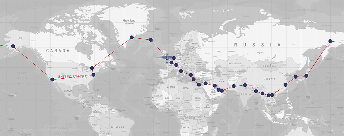 Reitti kulkee Isosta-Britanniasta länteen Islannin kautta kohti Grönlantia. Yhdysvaltain halki edettyään määränpäänä on Alaskan jälkeen Japani, Korea ja Kiina. Sieltä lennetään useamman muun Aasian maan halki kohti Lähi-itää ja edelleen Afrikan kautta takaisin Eurooppaan.