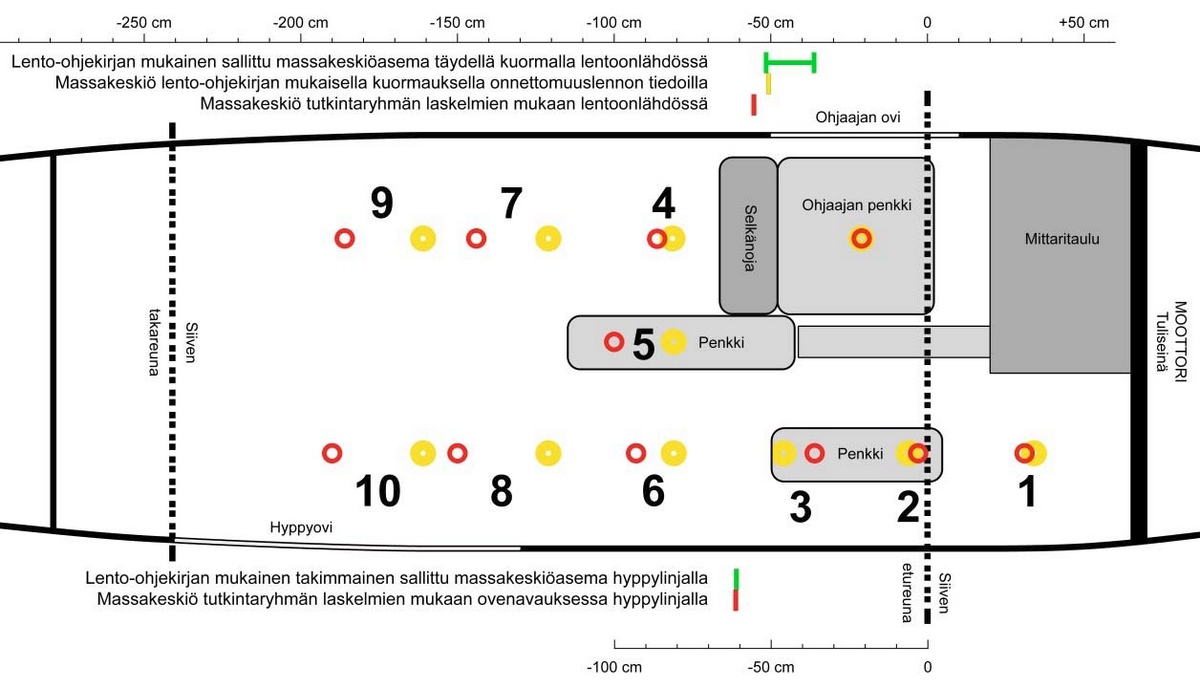 Pokalistan mukaan kymmenen hyppääjän yhteispaino oli 929 kg. Koneen kokonaispaino lentoonlähdössä oli tutkintaryhmän laskelmien mukaan 2 531 kg eli yhdeksän kiloa alle suurimman sallitun lentoonlähtöpainon. Tutkijoiden arvion mukaan massakeskiöasema oli hyppylinjalla todennäköisesti lento-ohjekirjassa määritettyjen rajojen takapuolella. Tähän vaikutti se, että rajoja määriteltäessä käytetyt hyppääjien istuinpaikat eivät olleet täydessä kuormassa mahdollisia (kuva yllä). Lisäksi uudelle hyppylinjalle hakeuduttaessa osa hyppääjistä oli jo siirtynyt valmiiksi exitiin ovelle. Rakennussarjasta kootun CompAirin siipiin oli Suomessa tehty rakenteellisia muutoksia. Siipiin oli rakennettu kärkievät eli wingletit. Ne lisäsivät siipitukiin vaikuttavia voimia, mutta niiden vaikutusta ei ollut selvitetty. Patrian mukaan muutos kasvatti siipituen aerodynaamisia veto- tai puristusvoimavaikutuksia 18–25 %. Rakennuslupaan ei ollut haettu Liikenteen turvallisuusvirastolta (Trafi) kirjallisesti lupaa tähän muutokseen. Rakentamisen valvojalta ja katsastajilta puuttui tieto muutosten alkuperästä tai vaikutuksista. OTKES: viisi turvallisuussuositusta Liikenteen turvallisuusvirasto Trafia suositetaan rajoittamaan riskiperusteisesti harrasterakenteisten ilma-alusten paikkalukua ja käyttöä laskuvarjohyppytoiminnassa. Onnettomuudessa tuhoutunut Comp Air 8 oli ainoa tällainen experimental-hyppykone Suomessa ja uusia ei tiettävästi ole rakenteilla. Samaten pitää varmistaa harrasteilmailun kehittämisprojektin yhteydessä, että Suomen Ilmailuliitto ry tekee hyppytoiminnalle malliohjeen, johon yhdistykset sisällyttävät hyppylentäjille tarkoitetun koulutusohjelman ja kokeet.