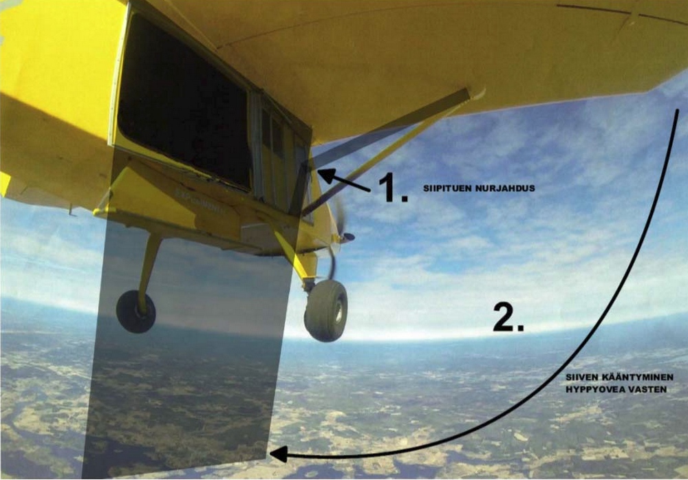 Siipiin syntyi alaspäin vaikuttava negatiivinen G-voima. Oikea siipituki nurjahti ja siipirakenne taittui tyvikiinnityksensä varassa alas runkoa vasten (otsikkokuva). Kone alkoi pyöriä ulkopuolisen syöksykierteen kaltaisessa liikkeessä pystyakselinsa ympäri. Syöksy alas kesti noin 55 sekuntia. Koneessa tehtiin päätös hätähypystä, mutta hyppyovea vasten taittunut siipi esti sen käytön. Kolme pelastunutta onnistuivat kierteen aiheuttamista 2-4 G:n voimista huolimatta poistumaan pienestä lentäjän ovesta. Ohjaaja hyppäsi pallokupuisella pelastusvarjollaan noin 1800 metrissä. Viimeisinä ulos päässeiden kahden hyppääjän urheilulaskuvarjojen Cypres-automaattilaukaisimet toimivat miltei välittömästi, noin 200 metrissä, joten he pääsivät ulos viime tipassa. Lentäjä laskeutui varjollaan tuulen alapuolelle ajautuneena noin 300 metrin päähän hylystä. Toinen hyppääjistä laskeutui hiekkatielle noin 60 metrin päähän ja toinen metsään noin 40 metrin päähän hylystä. Lentäjä ja toinen hyppääjä loukkaantuivat alastulossa. Muut koneessa olleet menehtyivät koneen syöksyessä harvaan metsämaastoon noin kilometri Jämin kentältä. Pelastustoimet käynnistyivät välittömästi ja koneesta hypänneet löydettiin nopeasti. Hankala tutkinta