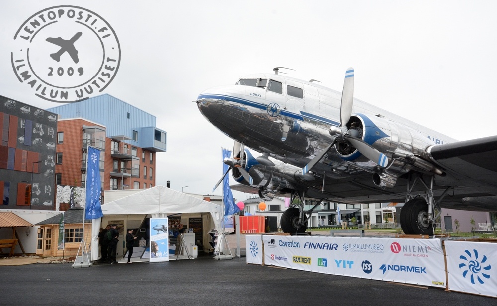 Messujen keskusaukiolla on näytteillä Airveteranin toinen DC-3, OH-LCD Lokki. Kone on palvellut Finnairin edeltäjää Aeroa sekä myöhemmin myös Ilmavoimia. Lokin vieressä sijaitsee Suomen Ilmailumuseon esittelypiste (kuvassa), jossa on myytävänä mm. DC-3-aiheista tavaraa. OH-LCH teki toisen ylilentokierroksen vielä kello 13.00 jälkeen iltapäivällä, jonka jälkeen se palasi jälleen messulentojen lähtökentälle Helsinki-Vantaalle. +TT+ Lue myös aiempia Lentoposti.fi -juttuja aiheesta: