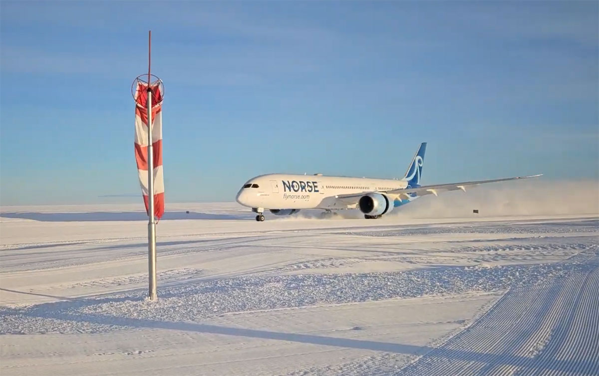 Norse Atlantic Airwaysin Boeing 787-9 Dreamliner -laajarunkokone (LN-FNC) laskeutui Trollin tutkimusaseman skiwaylle keskiviikkona 15. marraskuuta kello 02.01 paikallista aikaa.