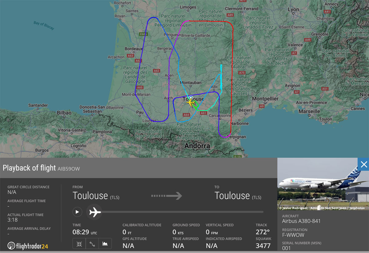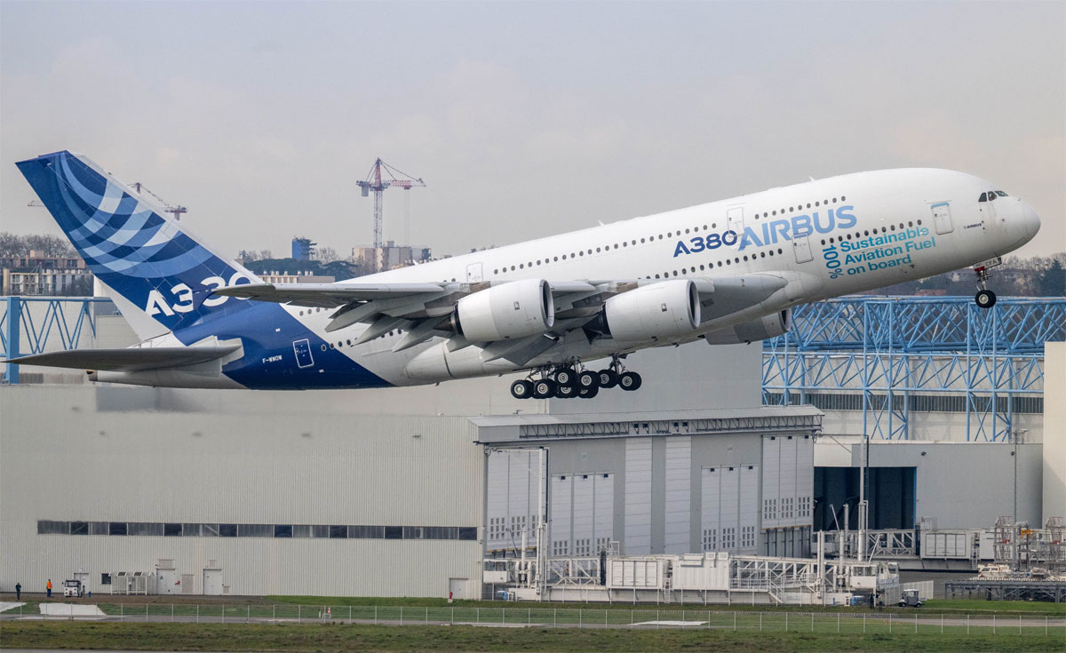 Airbus A380 -koelentokone nousi ilmaan Toulousesta 14. maaliskuuta 2025. Kyseessä on ensimmäisen A380-koneen ensimmäinen lento lähes kolmen vuoden tauon jälkeen. F-WWOW -rekisterillä tunnettu koneyksilö lensi edellisen kerran toukokuussa 2022.