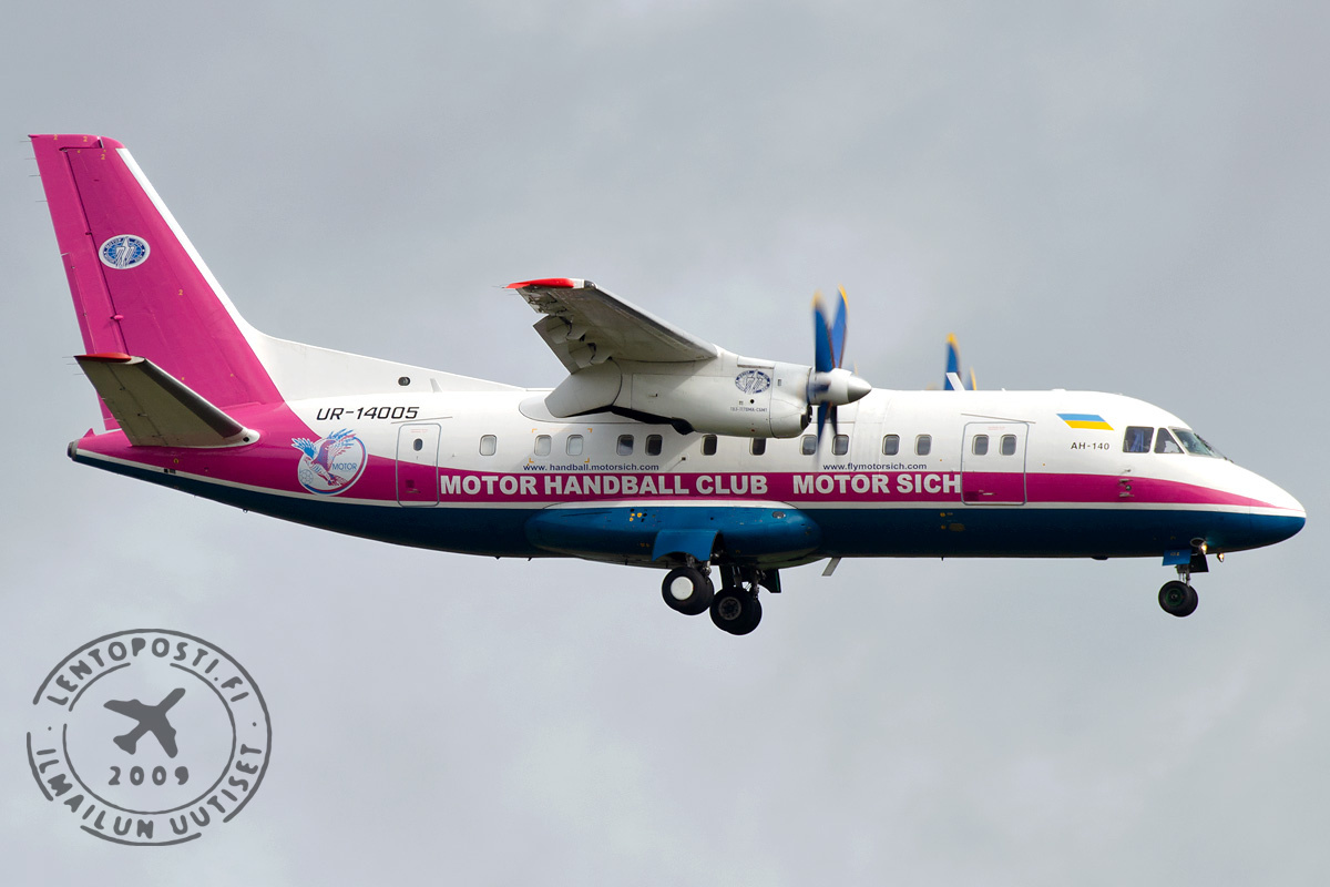 Helsinki-Vantaalle 5. syyskuuta laskeutunut Motor Sich Airlinesin Antonov 140 -kone kuljetti Suomeen Ukrainan alle 21-vuotiaiden jalkapallojoukkueen. Lento saapui Suomeen Tanskan Aalborgista. Kyseessä on konetyypin ensimmäinen vierailu Suomeen.