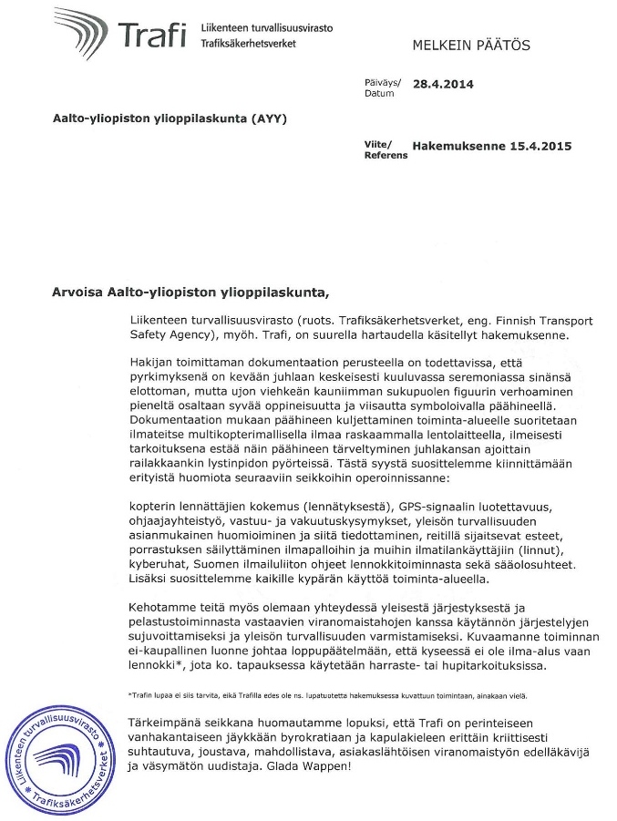 "Hakijan toimittaman dokumentaation perusteella on todettavissa, että pyrkimyksenä on kevään juhlaan keskeisesti kuuluvassa seremoniassa sinänsä elottoman, mutta ujon viehkeän kauniimman sukupuolen figuurin verhoaminen pieneltä osalta syvää oppineisuutta ja viisautta symboloivalla päähineellä." Luvassa käyttää nelikopteria on myös ehtoja lentotoiminnalle: "Kopterin lennättäjien kokemus (lennätyksestä), GPS-signaalin luotettavuus, ohjaajayhteistyö, vastuu- ja vakuutuskysymykset, yleisön turvallisuuden asianmukainen huomioiminen ja siitä tiedottaminen, reitillä sijaitsevat esteet, porrastuksen säilyttäminen ilmapalloihin ja muihin ilmatilan käyttäjiin (linnut) ja kyberuhat". Trafi myös toteaa, että "kyseessä ei ole ilma-alus vaan lennokki", joten lupaa ei edes tarvittaisi. "Melkein päätöksen" toisella sivulla on mm. ilmailujohtaja Pekka Hentun allekirjoitus ja asian vakuudeksi lukuisia Liikenteen turvallisuusviraston leimoja. +TT+ Video Mantan lakituksesta nelikopterilla (alkaen kohdasta 11.30): MTV.fi