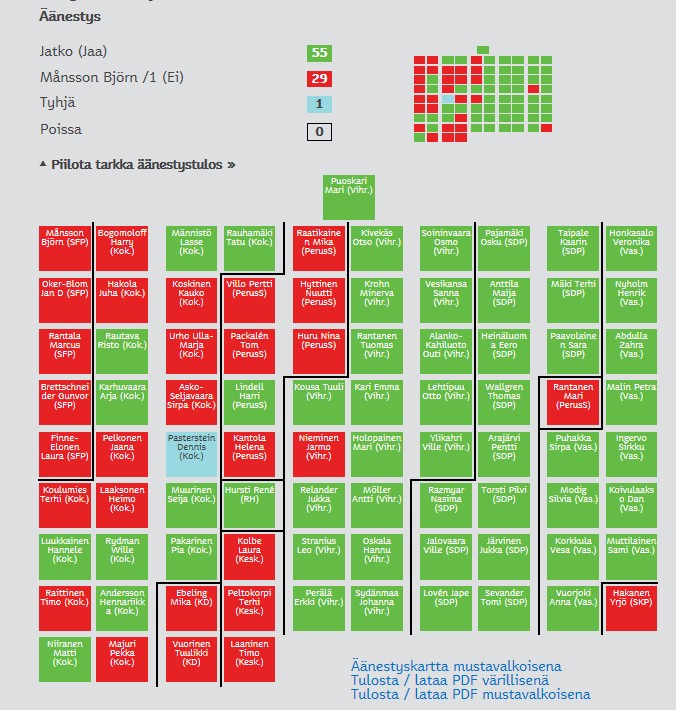 Kaupunginvaltuuston jäsenet - JAA (Helsinki-Malmi ei säily ilmailukäytössä) Abdulla Zahra (Vas.) Alanko-Kahiluoto Outi (Vihr.) Andersson Hennariikka (Kok.) Anttila Maija (SDP) Arajärvi Pentti (SDP) Heinäluoma Eero (SDP) Holopainen Mari (Vihr.) Honkasalo Veronika (Vas.) Hursti René (RH) Ingervo Sirkku (Vas.) Jalovaara Ville (SDP) Järvinen Jukka (SDP) Karhuvaara Arja (Kok.) Kari Emma (Vihr.) Kivekäs Otso (Vihr.) Koivulaakso Dan (Vas.) Korkkula Vesa (Vas.) Kousa Tuuli (Vihr.) Krohn Minerva (Vihr.) Lehtipuu Otto (Vihr.) Lindell Harri (PerusS) Lovén Jape (SDP) Luukkainen Hannele (Kok.) Malin Petra (Vas.) Modig Silvia (Vas.) Muttilainen Sami (Vas.) Muurinen Seija (Kok.) Mäki Terhi (SDP) Männistö Lasse (Kok.) Möller Antti (Vihr.) Niiranen Matti (Kok.) Nyholm Henrik (Vas.) Oskala Hannu (Vihr.) Paavolainen Sara (SDP) Pajamäki Osku (SDP) Pakarinen Pia (Kok.) Perälä Erkki (Vihr.) Puhakka Sirpa (Vas.) Puoskari Mari (Vihr.) Rantanen Tuomas (Vihr.) Rauhamäki Tatu (Kok.) Rautava Risto (Kok.) Razmyar Nasima (SDP) Relander Jukka (Vihr.) Rydman Wille (Kok.) Sevander Tomi (SDP) Soininvaara Osmo (Vihr.) Stranius Leo (Vihr.) Sydänmaa Johanna (Vihr.) Taipale Kaarin (SDP) Torsti Pilvi (SDP) Wallgren Thomas (SDP) Vesikansa Sanna (Vihr.) Vuorjoki Anna (Vas.) Ylikahri Ville (Vihr.) Kaupunginvaltuuston jäsenet - EI Asko-Seljavaara Sirpa (Kok.) Bogomoloff Harry (Kok.) Brettschneider Gunvor (SFP) Ebeling Mika (KD) Finne-Elonen Laura (SFP) Hakanen Yrjö (SKP) Hakola Juha (Kok.) Huru Nina (PerusS) Hyttinen Nuutti (PerusS) Kantola Helena (PerusS) Kolbe Laura (Kesk.) Koskinen Kauko (Kok.) Koulumies Terhi (Kok.) Laaksonen Heimo (Kok.) Laaninen Timo (Kesk.) Majuri Pekka (Kok.) Månsson Björn (SFP) Nieminen Jarmo (Vihr.) Oker-Blom Jan D (SFP) Packalén Tom (PerusS) Pelkonen Jaana (Kok.) Peltokorpi Terhi (Kesk.) Raatikainen Mika (PerusS) Raittinen Timo (Kok.) Rantala Marcus (SFP) Rantanen Mari (PerusS) Urho Ulla-Marja (Kok.) Villo Pertti (PerusS) Vuorinen Tuulikki (KD) Kaupunginvaltuuston jäsenet - TYHJÄ Pasterstein Dennis (Kok.) Päivitys 20.30: Lisätty tieto aloitteen kaatumisesta Lue myös: