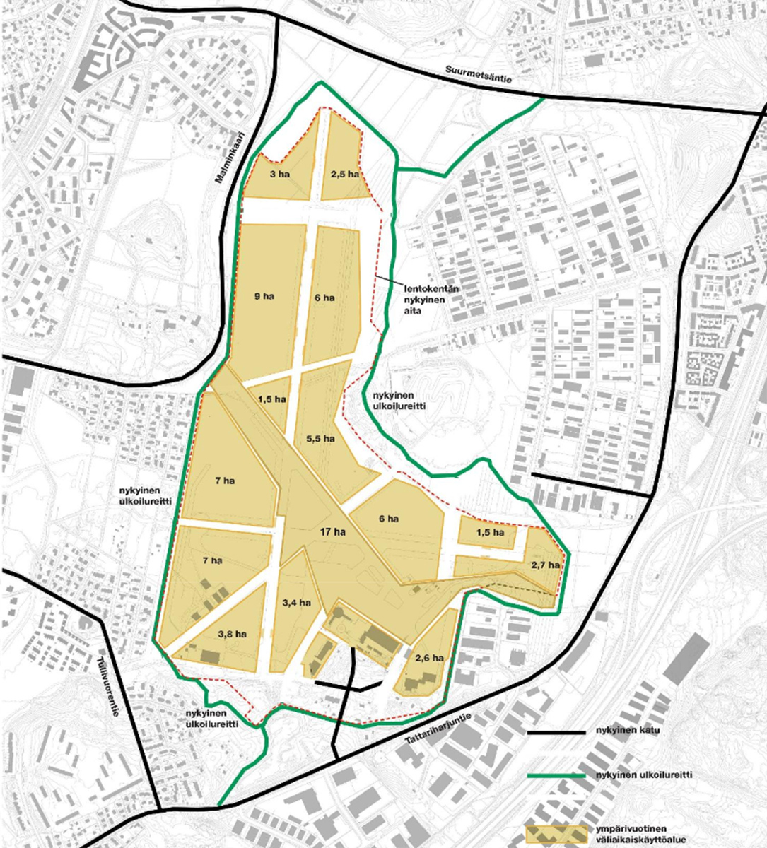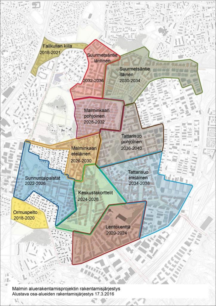 Myös maaperän heikko kantavuus ennen esirakentamista asettaa omat rajoitteensa. Kaupungin suunnitelmana on, että Malmin kentän alueelle rakennetaan 2020–2040 noin 13 500 asuntoa 25 000 asukkaalle. Tämänhetkisen arvion mukaan esirakentaminen lentokentällä voisi alkaa 2019 ja talonrakentaminen 2020. UuttaHelsinkiä.fi - Malmin lentokenttä Lue myös: