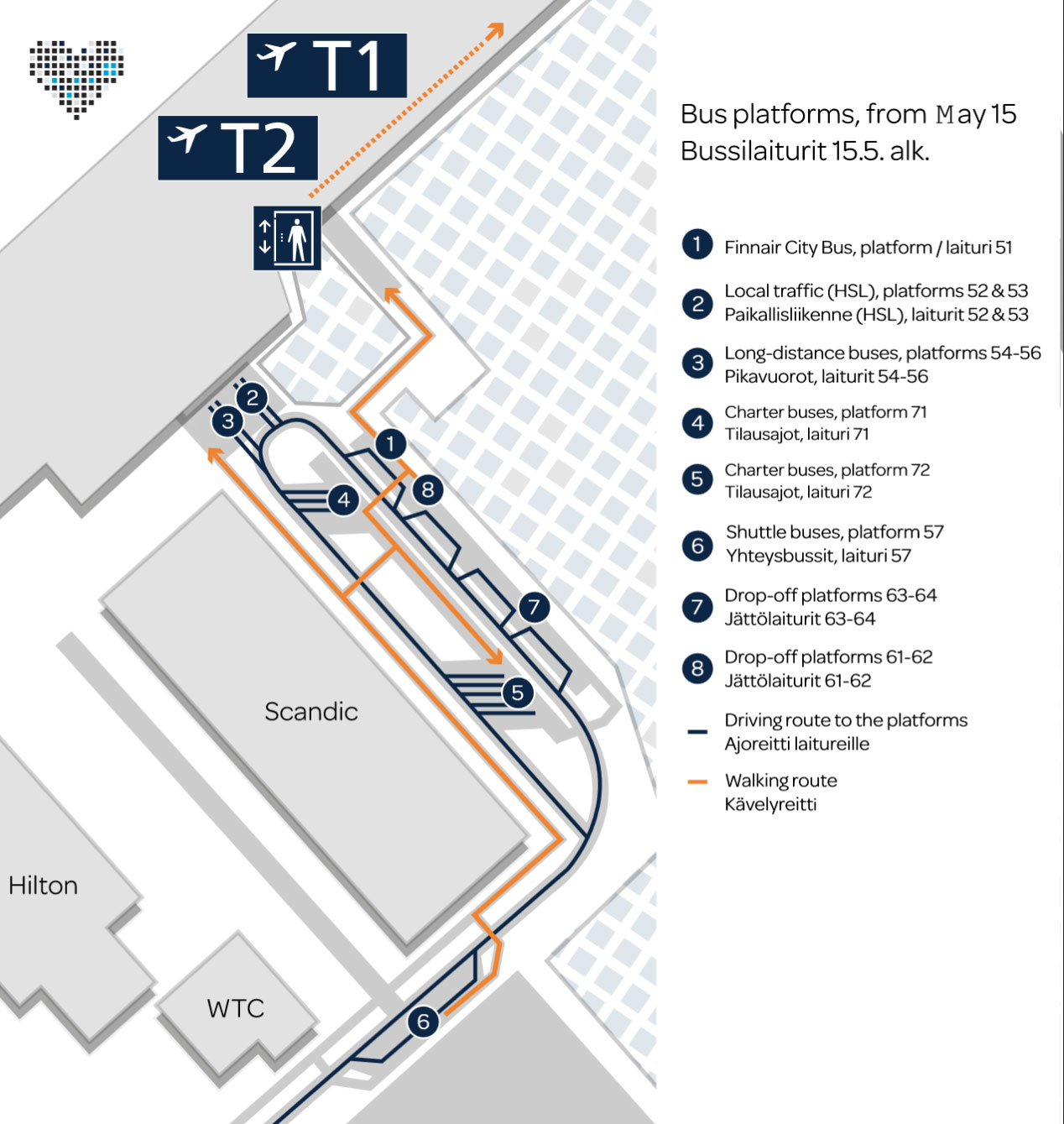 Bussiasemalle valmistuu kesäkuun alkuun mennessä liukuportaat, joita pitkin pääsee kätevästi suoraan terminaali 2:n lähtöselvityskerrokseen. Terminaalista bussiasemalle pääsee puolestaan tuloaula 2B:n kautta.