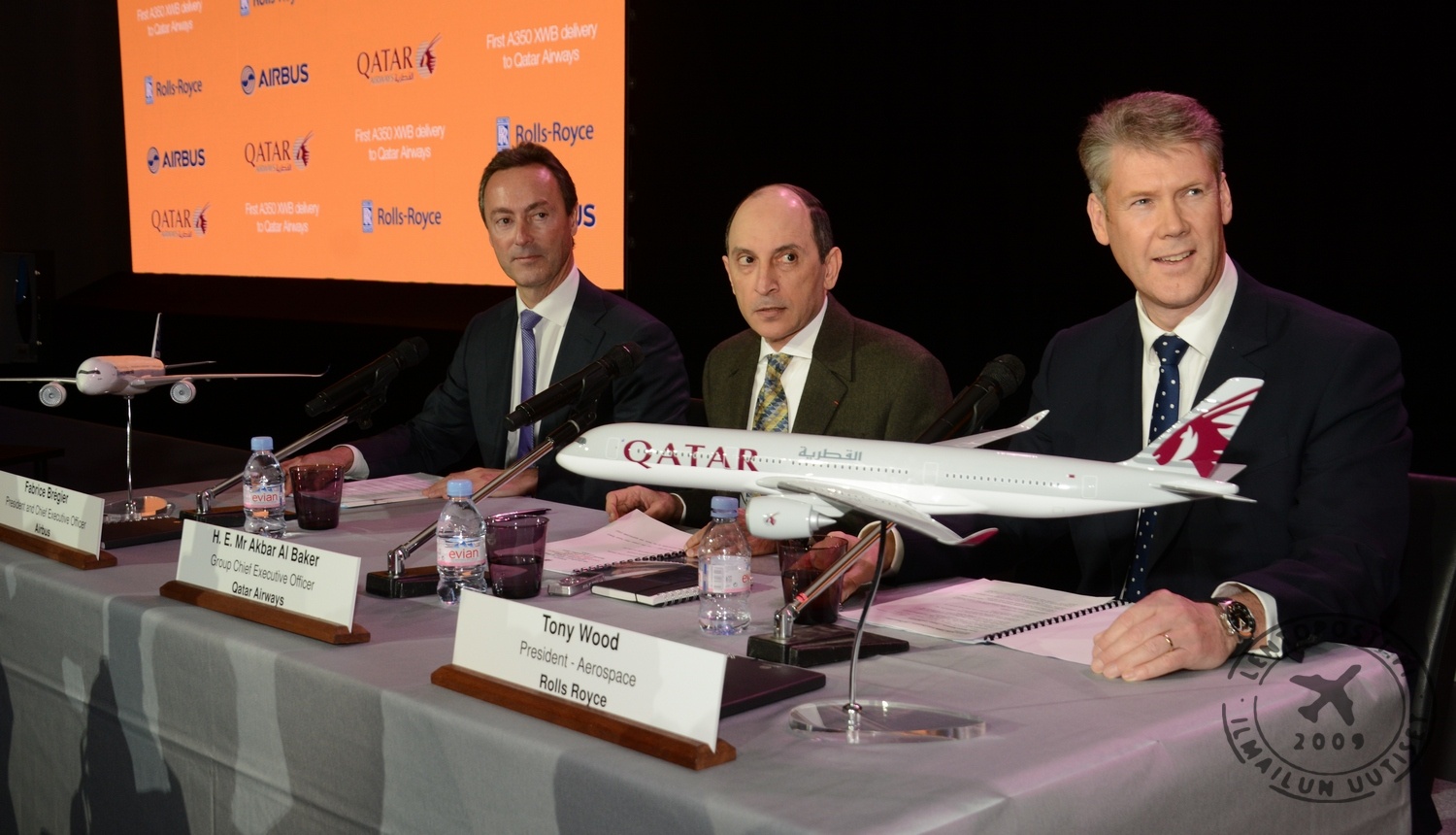 "Olemme ylpeitä, että olemme saaneet työskennellä Qatar Airwaysin ja Airbusin kanssa A350 XWB:n parissa käyttäen uusinta teknologiaa asiakaskokemuksen nostamiseksi uudelle tasolle. Tämä on tärkeä päivä Rolls Roycelle. Tämä on monen vuoden työn huipentuma ja aloittaa uuden aikakauden liiketoiminnassamme", vakuutti John Rishton, Rolls Roycen toimitusjohtaja. Qatar Airways on tilannut kaikkiaan 80 Airbus A350 XWB -konetta, joista tuotannon kahdeksan ensimmäistä konetta liittyy yhtiön laivastoon vuoden 2015 loppuun mennessä. Yhtiön 17-vuotisen historian aikana kasvu on ollut suurta. Nykyisin laivastossa on 142 konetta, joilla se lentää 145 kohteeseen Euroopassa, Lähi-Idässä, Afrikassa, Aasian ja Tyynenmeren alueella sekä Pohjois- ja Etelä-Amerikassa. Finnair ensimmäinen eurooppalaisoperaattori