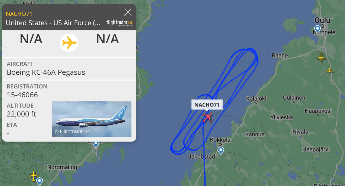 Ilmavoimat harjoittelee Suomen yllä Yhdysvaltain ilmavoimien KC-46A Pegasus -ilmatankkauskoneen kanssa. Ilmavoimien F/A-18 Hornet -monitoimihävittäjäohjaajat ylläpitävät harjoituksen avulla ilmatankkauskelpuutuksia. KC-46A harjoitteli ensimmäisen kerran Suomen Hornetin kanssa joulukuussa 2022.