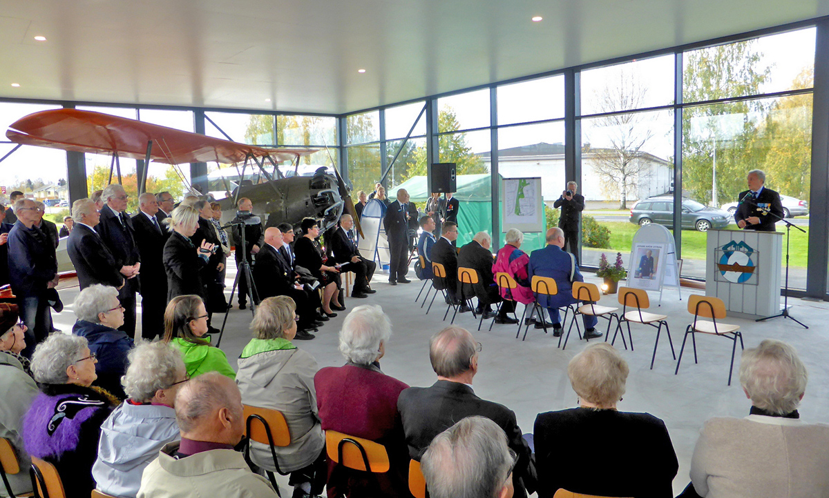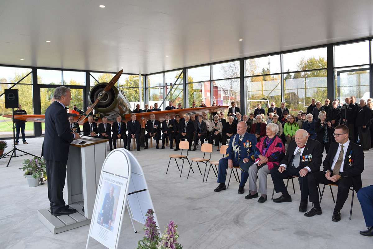 Juhlapuheen piti Ilmavoimien entinen komentaja, kenraaliluutnantti Rauno Meriö, joka on juhlan kunniavieraan Juhani Ahon kurssitoveri Lentoupseerikurssi 19:ltä. Meriö kertoi vauhdikkaassa puheessaan omia värikkäitä muistojaan lentoupseeri- ja kadettikurssin aikaisista lennoistaan Kauhavalla erityisesti Stieglitzillä ja Pyryllä. Kauhavan kaupungin laatimaassa puistosuunnitelmassa on varattu vielä tila Fouga Magister -patsaalle sekä paikka toiselle kolmen koneen vitriinille. Lähivuosina valmistuva lentokonepuisto on ainutlaatuinen kokonaisuus Pohjoismaissa.