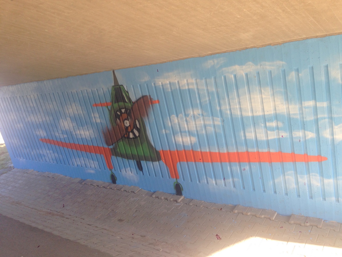 Alikulkutunnelin Lentokonepuiston puoleisessa päässä on kaksi vuosilukua, perustuvat Kauhavan historiaan Vuonna 1929 Ilmavoimat aloitti lentokoulutuksen Kauhavalla ja vuonna 2014 koulutus lopetettiin ja varuskunta lakkautettiin. Tunnelin toista päätä koristavat uljaat siivet. Tunnelin seinissä ovat vanha suomalainen VL Pyry- harjoituskone sekä sen ohjaaja ja BAE Systems Hawk -suihkuharjoituskone. Molemmat konetyypit ovat esillä myös Lentokonepuiston kokoelmissa.