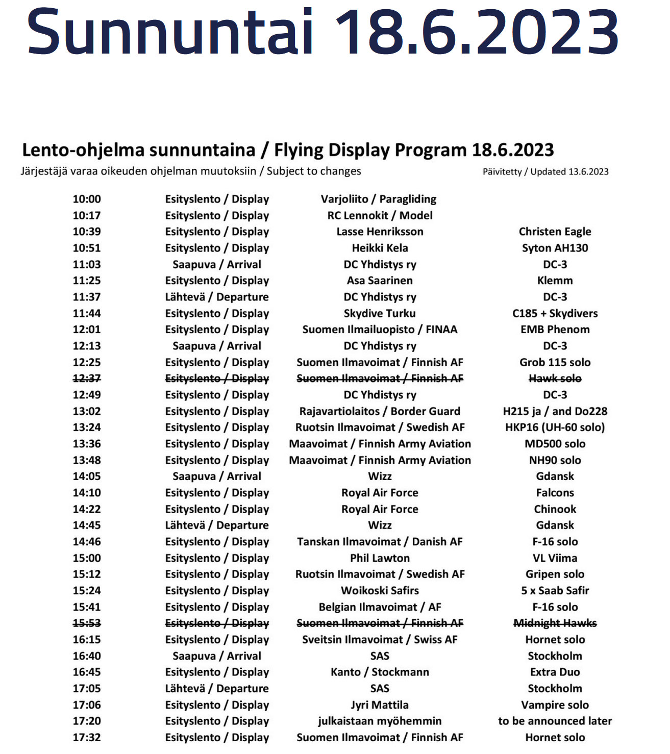 Päivitys kello 23.06: Lisätty tieto sunnuntain lisäohjelmasta. RAF:n Typhoon tulee paikalle.