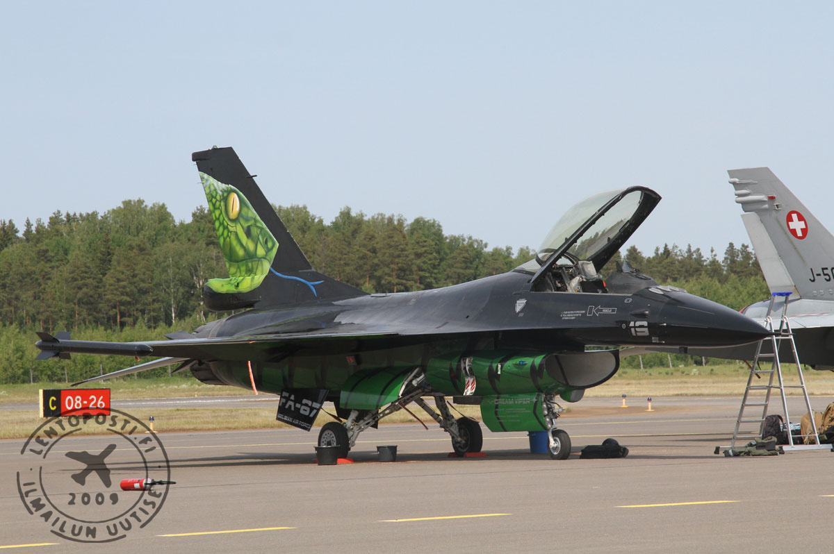 Vauhtia ja ääntä on luvassa myös F-16 -hävittäjiltä, joita on tarjolla niin ikään vertailukaksikko. Tanskan ilmavoimien F-16 -hävittäjä lentää punavalkoisissa maan lipun väreissä ja samaa teemaa noudattaa myös punavalkoiseksi maalattu hävittäjälentäjä Troels “TEO” Vangin kypärä.