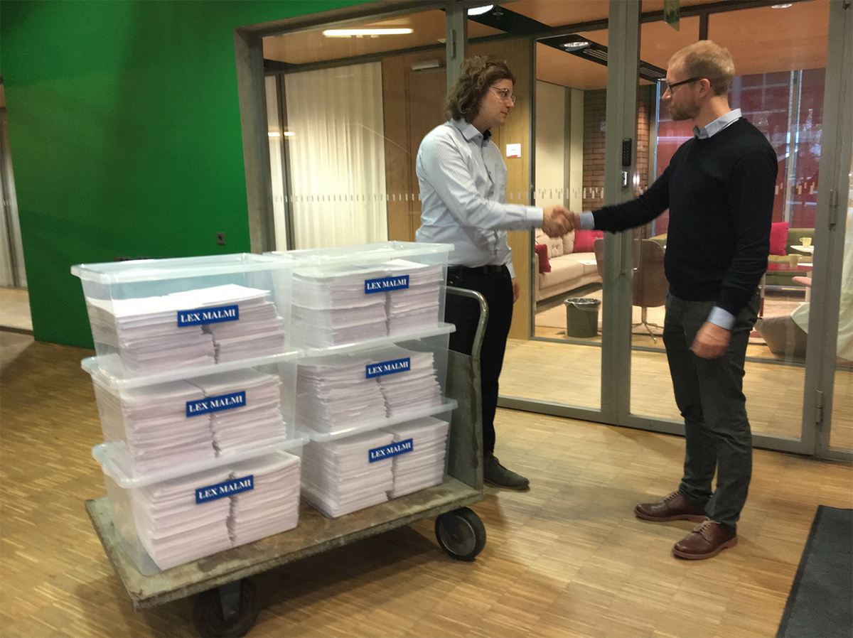 Väestörekisterikeskuksen tarkistamista paperilomakkeille kerätyistä Lex Malmin kannatusilmoituksista hylättiin alle kaksi prosenttia. Aloite sai kahdessa kuukaudessa runsaan 56000 kansalaisen kannatuksen.