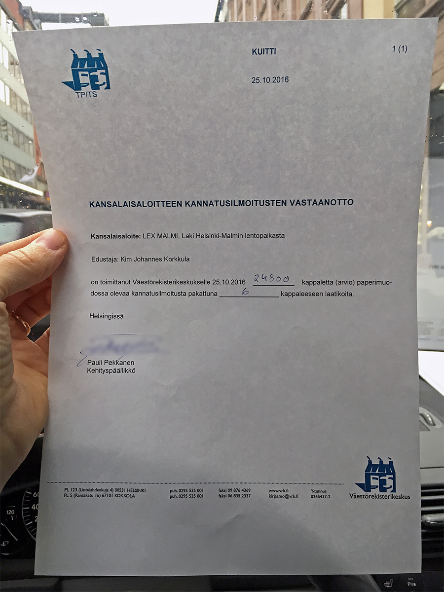 Väestörekisterikeskus on laskenut Lex Malmin kannatusilmoitukset ja todennut kansalaisaloitteen kannattajamäärän ylittävän selvästi eduskuntakäsittelyyn vaadittavan määrän. Lex Malmi -kansalaisaloite pyrkii Malmin lentoaseman säilyttämiseen ilmailukäytössä. Lex Malmi etenee eduskuntaan kevään 2017 aikana.