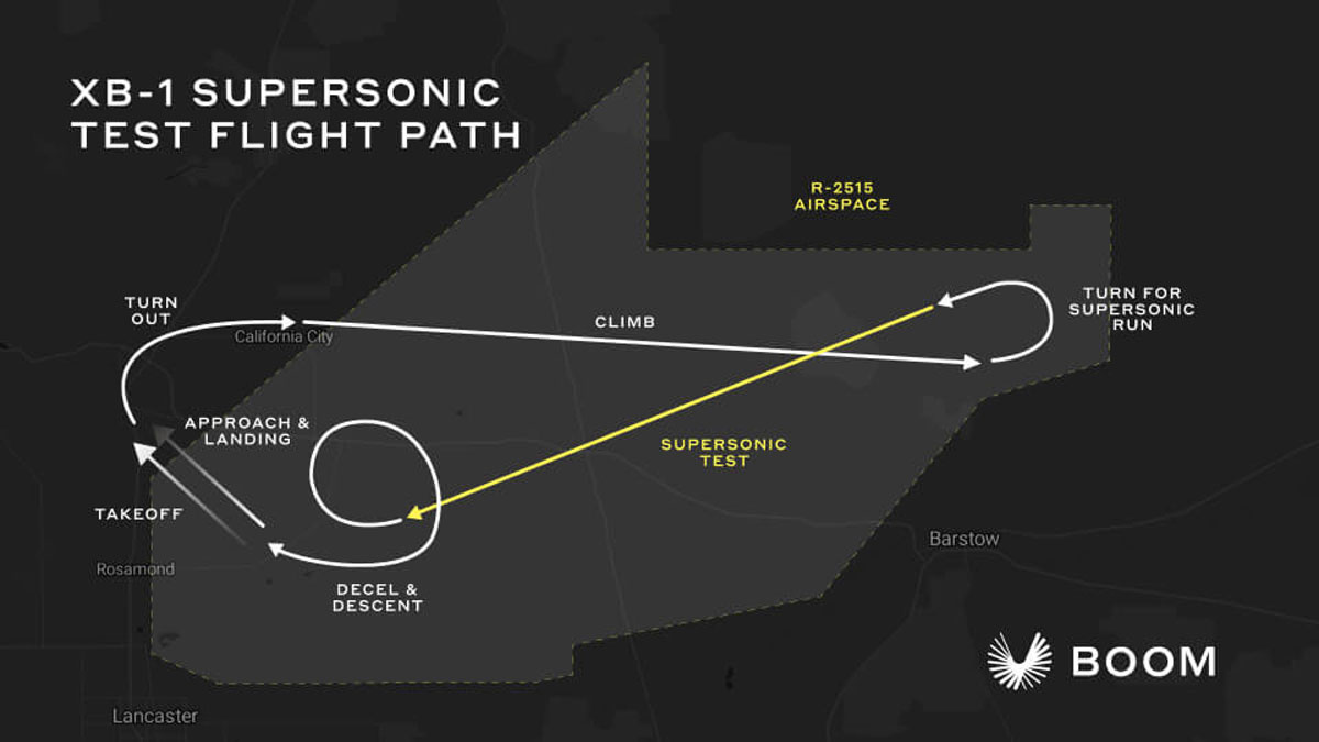Miragen lentäjä on yhteydessä lennonjohtoon mahdollistaen pääkoelentäjä Brandenburgille työrauhan XB-1:n ohjaamossa. T-38 puolestaan lähettää Starlink-järjestelmän kautta suoraa videomateriaalia taivaalta. XB-1 siirtyi kiitotielle kello 18.18 Suomen aikaa. Noin kello 18.21 Suomen aikaa tapahtuneen onnistuneen lentoonlähdön jälkeen Mirage F1 -seurantakone lensi XB-1:n siivelle tarkastaakseen, että koekone on varmasti edelleen kunnossa ylisoonista lentoa varten. Noin yhdentoista minuutin lennon jälkeen Brandenburg käynnisti jälkipolton ja kiihdytti XB-1:n 34 000 jalan korkeudessa ylisooniselle nopeusalueelle saavuttaen odotetun nopeuden Mach 1,1. Lennon aikana nähtiin suurimmillaan Mach 1,122 nopeus.