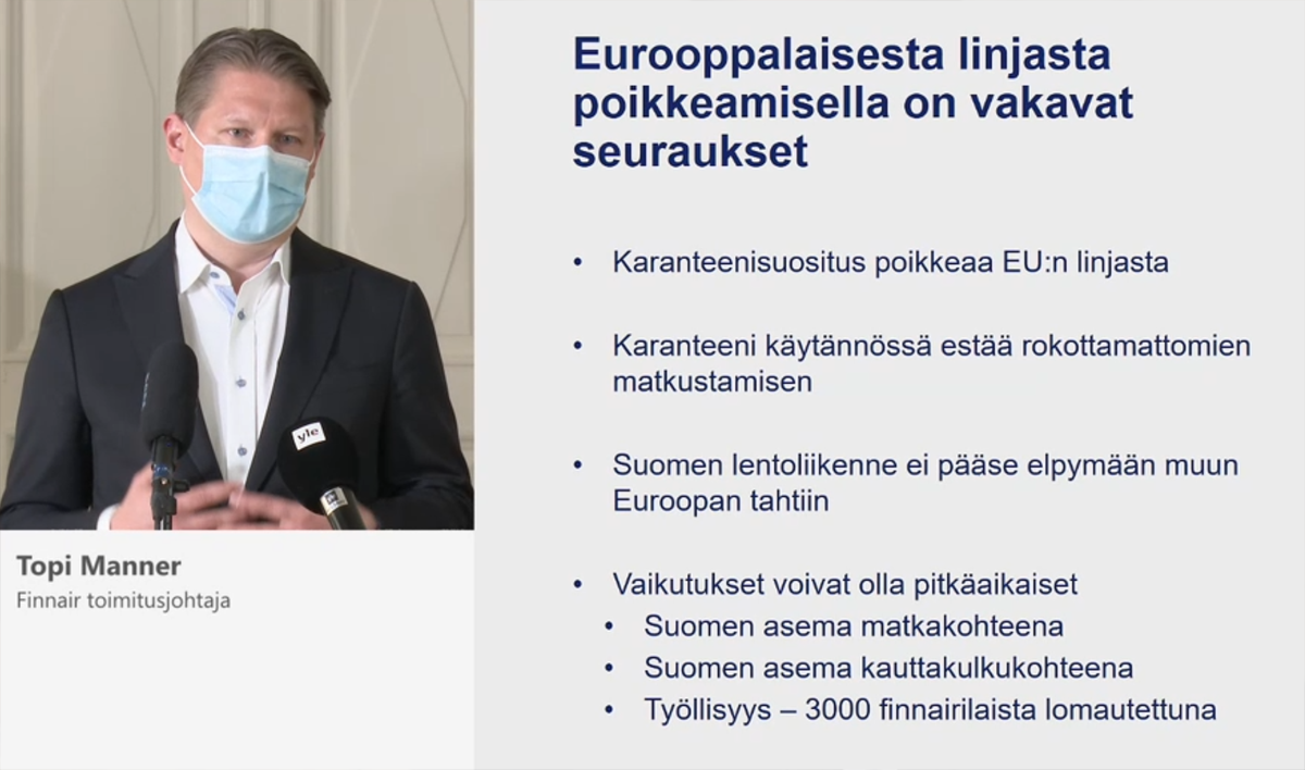 Finnairin toimitusjohtaja Topi Manner on huolissaan pitkäaikaisista vaikutuksista, joita lentoliikenteelle ja muille matkailusta riippuville aloille voi seurata siitä, että ulkomaisten matkailijoiden tuloa Suomeen ei mahdollisteta muun EU:n tapaan.