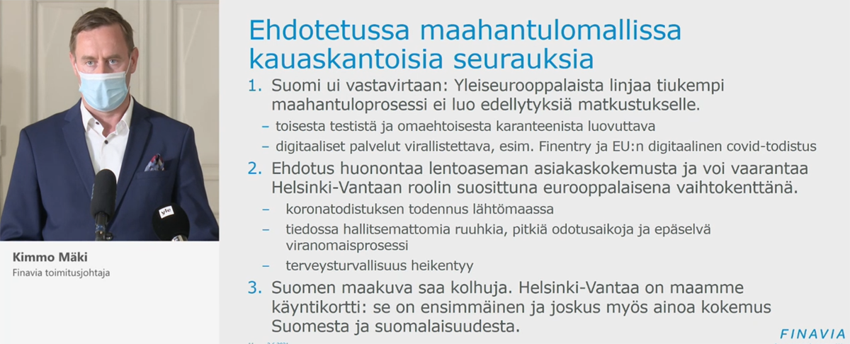 ”Lentoasemilla tapahtuvat terveystarkastukset lisäävät taudin leviämisen riskiä, aiheuttavat ruuhkia, heikentävät asiakaskokemusta ja vaikuttavat siihen kuvaan, mikä matkailijoille jää Suomesta ja asioiden sujuvuudesta maassamme”, Mäki sanoo.