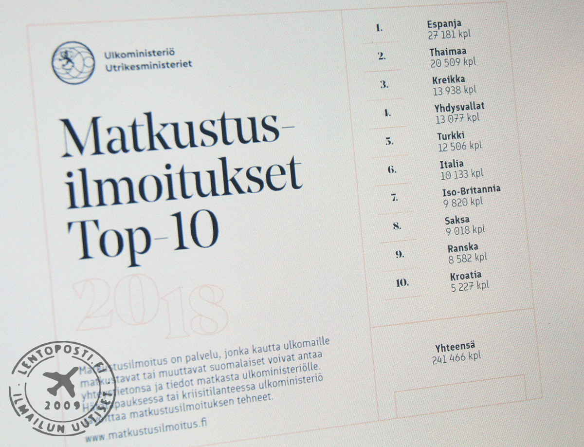 Sitä varten on hyvä muistaa ministeriön mainostamat neljä M-kirjainta, joista yksi on juuri matkustusilmoituksen tekeminen. Muut ovat matkustustiedote, matkavakuutus ja matkustuasiakirja. Matkustusilmoitusten TOP10-listalla olivat Espanja, Thaimaa, Kreikka, Yhdysvallat, Turkki, Italia, Iso-Britannia, Saksa, Ranska ja Kroatia. Kaikkiaan matkailijat tekivät vuoden 2018 aikana 241 466 kappaletta. Ulkoministeriön osastolla on tarjolla myös tekomaanjäristys ja siihen liittyvä video, joka kertoi matkustusilmoituksen tärkeydestä. Kotimaan kohteiden alueelta Matkamessuilta löytyy Helsingissä kauppakeskus Redissä sijaitsevan Fööni-vapaapudotustunnelin osasto. Kävijöitä houkutellaan kokeilemaan lentämisen tunnetta 49 euron messutarjouksella.
