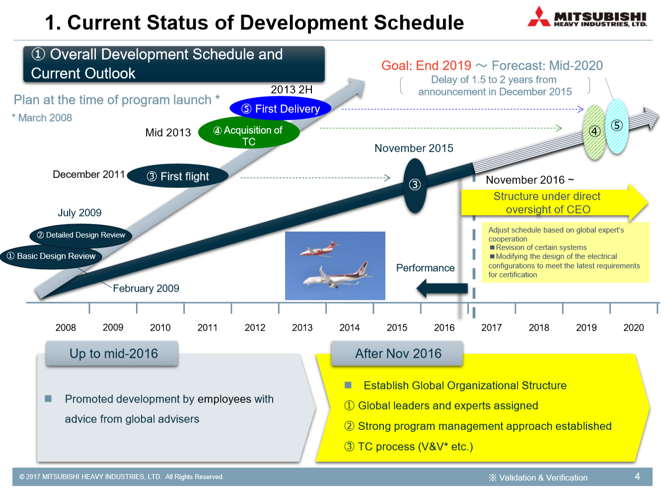 Ensimmäinen MRJ90-matkustajakone oli määrä toimittaa avausasiakkaalle All Nippon Airwaysille (ANA) vuoden 2018 puolivälissä. Nyt ilmoitettu uusi aikataulu siirtää toimitusta vuoden 2020 puoliväliin saakka. Alunperin ensimmäinen kone oli määrä toimittaa asiakkaalle jo vuoden 2013 aikana.