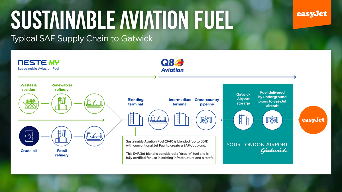 Nesteen tuottama uusiutuva lentopolttoaine sekoitetaan Jet A-1 -polttoaineeseen Gatwickin lentoaseman lähtövarastolla. Näin syntyy ns. drop-in-polttoainetta, joka sopii käytettäväksi nykyisissä lentokonemoottoreissa ja lentokenttäinfrastruktuureissa ilman niihin tehtäviä lisäinvestointeja. Q8Aviation on toimittanut polttoaineen Gatwickin lentoaseman pääsäiliöihin, joista se toimitetaan lentoaseman jakelujärjestelmän kautta easyJetin lentokoneisiin.