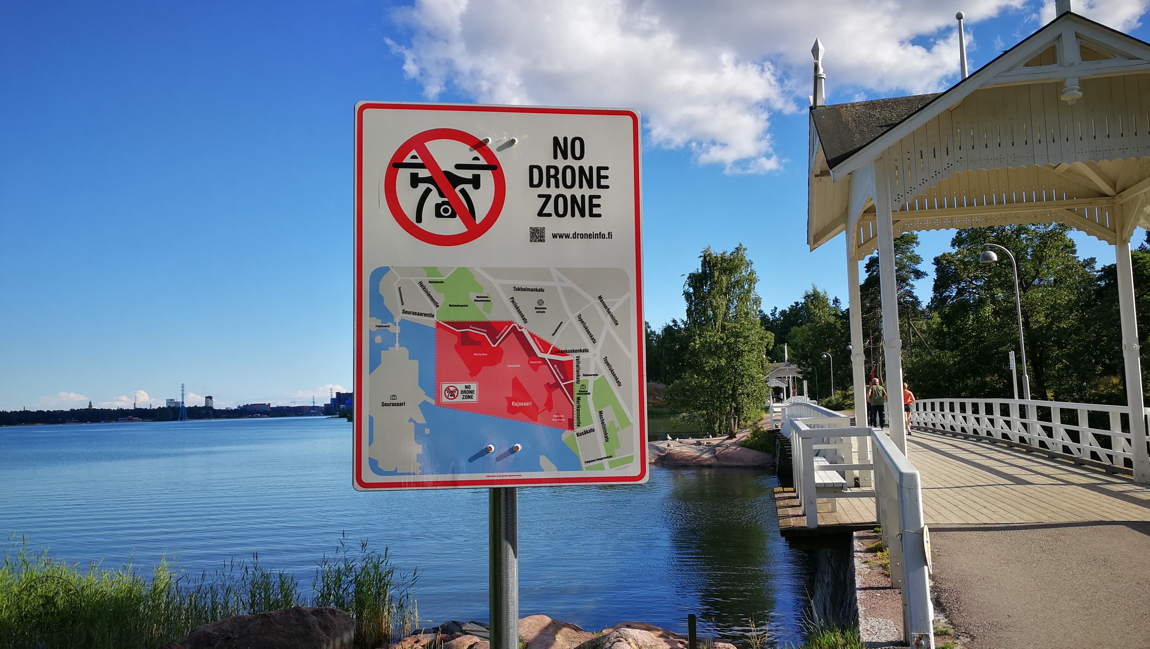 Kyseisillä kylteillä pyritään viestittämään kieltoalueista, joita valtioneuvosto asetti toukokuussa 2015 Helsinkiin ja Naantaliin turvamaan valtiollisia kohteita. Aiemmin tieto kyseisten alueiden olemassaolosta ei ollut kunnolla tavoittanut drone-lennättäjiä.