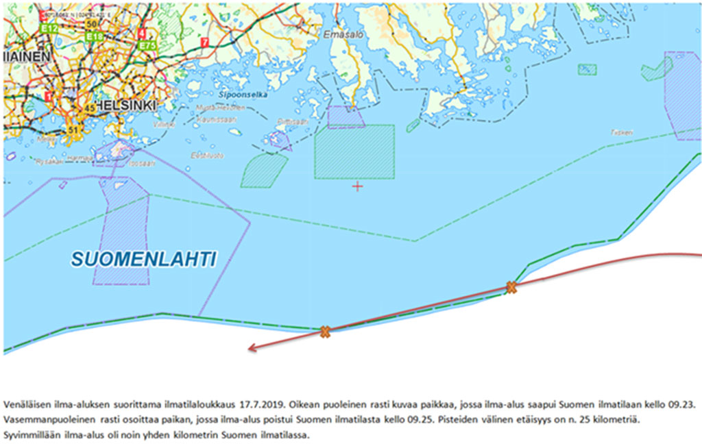 Ilma-alus saapui Suomen ilmatilaan Porvoon edustalla kello 09.23. Lennettyään Suomen ilmatilassa noin 25 kilometrin matkan poistui se Suomen ilmatilasta kello 09.25. Syvimmillään kone lensi yhden kilometrin syvyydessä Suomen ilmatilassa. Esitutkinnan valmistuttua on tapauksen tutkinnanjohtaja päätynyt esittämään syyttäjälle esitutkinnan rajoittamista. Esitutkinnassa ei ole selvinnyt ilma-aluksen lentäjien henkilötietoja, eikä asiassa näin ollen ole mahdollisuutta nostaa syytettä ketään vastaan.