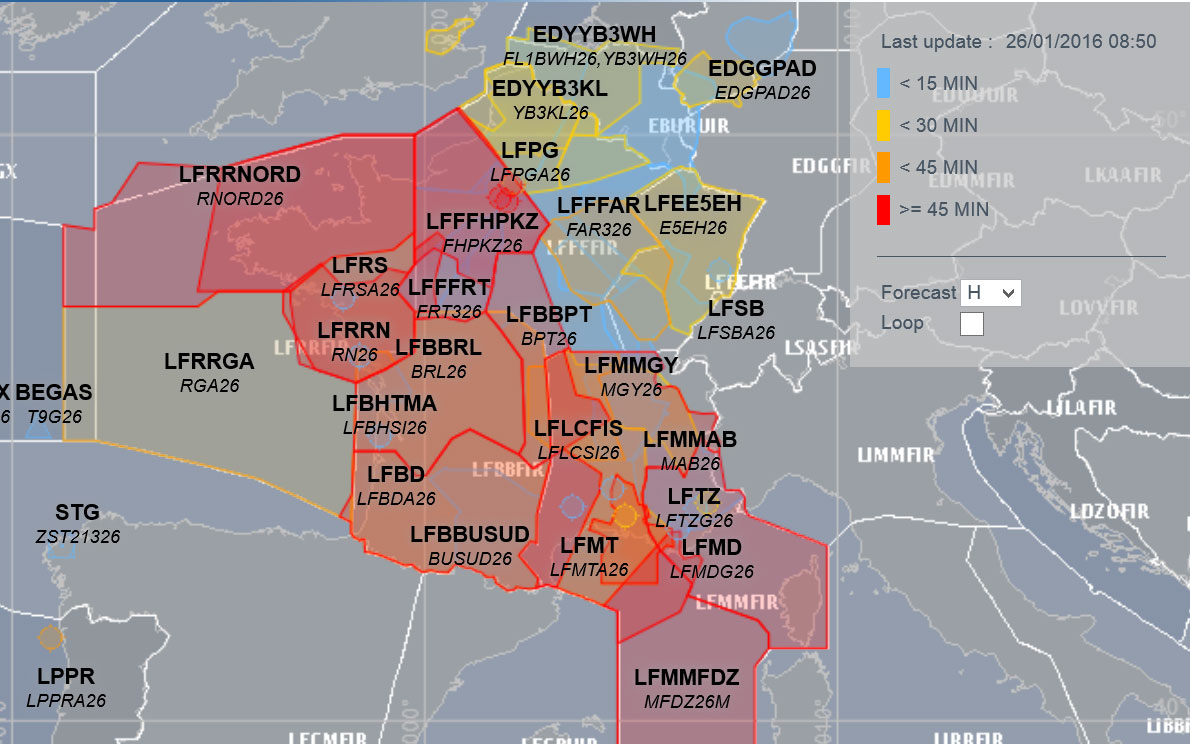 Lakkotoimien aiheuttama lentoliikenteen sääntely koskee kaikkia viittä Ranskan aluelennonjohtoja ja lentokenttiä. Viiveiden arvioidaan olevan pahimmillaan erittäin pitkiä ja tilanteen odotetaan jatkuvan samanlaisena koko päivän. Ranskan DGAC on pyytänyt lentoyhtiöivä vähentämään kapasiteettia 20 prosentilla. Eurocontrol pyrkii ohjaamaan liikennevirtoja muualle ottamalla käyttöön muuten rajoitettuja ATS-reittejä. Kaikkiaan yleislakossa ovat liitot CGT, FO ja SNCTA. Työnseisaukset alkoivat kokonaisuudessaan maanataina 25. tammikuuta kello 18.00 UTC-aikaa ja päättyvät keskiviikkona 27. tammikuuta kello 0500 UTC-aikaa. Lennonjohtajat vastustavat lakollaan palkanalennuksia sekä tulevia työpaikkojen menetyksiä. Euroopan suurimman halpalentyhtiö Ryanairin laskelmien mukaan kyseessä on jo 40:s lennonjohtajien lakko Ranskassa vuodesta 2009 lähtien. Se aloittikin keskustelun Ranskan valtion ja EU-komission suuntaan välittömistä toimista tuhansien matkustajien edun nimissä. Ryanair vaatii lakko-oikeuden poistamista Euroopan lennonjohtajien yhdistyksiltä, että ne olisivat samassa asemassa eri maiden armeijan ja poliisivoimien kanssa. Toisena vaatimuksena se esittää, että muut Euroopan lennonjohdot huolehtisivat lakon aikana Ranskan ilmaliikenteen hallinnasta. Lentoyhtiöt ovat peruneet lentojaan. Air France aikoo operoida kaikki kaukolentonsa sekä 80 prosenttia lähiliikenteestään.Lakon aikaiset mielenilmaukset saattavat Air Francen mukaan vaikeuttaa kulkemista Paris-Charles de Gaullen, Paris-Orlyn, Toulousen, Marseillen ja Bordeaux'n lentokentille. Myös Finnair on perunut kello 12.15 Pariisiin lähtevän lennon AY875.