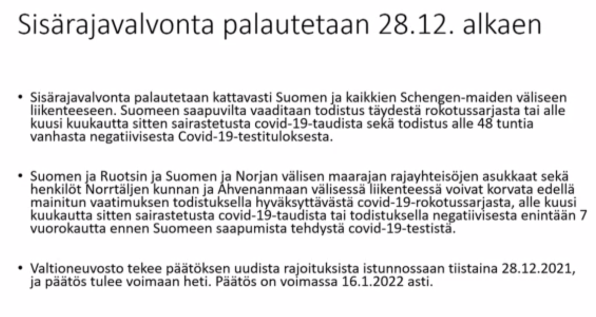 Negatiivista testitulosta ei edellytetä Suomen kansalaisilta, Suomessa pysyvästi asuvilta ulkomaalaisilta, eikä henkilöiltä, joiden maahantulon perusteena on välttämätön syy kuten pakottavat perheasiat tai muut pakottavat henkilökohtaiset syyt. Kaikkia matkustajia koskevat kuitenkin tartuntatautilain mukaiset vaatimukset todistusten esittämisestä ja Aluehallintoviranomaisten tekemät päätökset pakollisista terveystarkastuksista. Valvontaa tehdään rajallisesti ja se keskitetään riskipaikkoihin kuten lentoasemille. Maarajoilla valvontaa tehdään muiden toimien ohella. Tavoitteena on mahdollistaa turvallinen matkustaminen Suomeen. Toimilla turvataan hallituksen mukaan väestön terveyttä ja hyvinvointia. Myös rokoteohjelmaa vauhditetaan osaksi laajempaa väestösuojaa vakavia tautimuotoja vastaan. Myös koronapassi kielletään väliaikaisesti osittain erityisesti suuren riskin tilaisuuksissa 20. tammikuuta 2022 saakka epidemian kovimman vaiheen hillitsemiseksi. Lue myös: