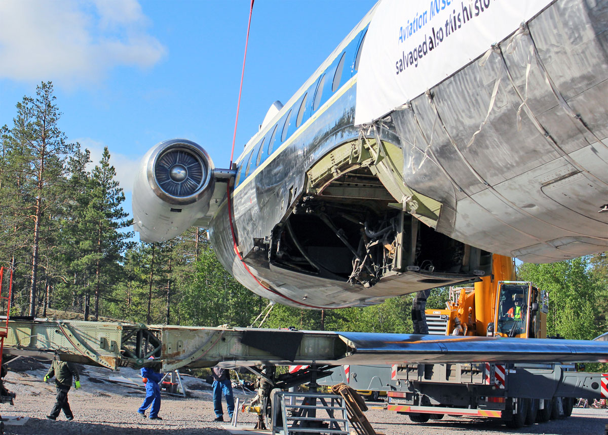 Finnairin historiallisissa väreissä nykyisin oleva Caravelle-koneen runko siirrettiin Pansion hallitiloista Ahola Special Transportin erikoiskuljetusrekalla 30. toukokuuta Turun lentoasemalle. Siellä runko yhdistettiin siipirakenteisiin. Siipien liittämistä yhteen ei Caravellejen käyttöaikana tehty koskaan Suomessa eikä muissa Pohjoismaissa.