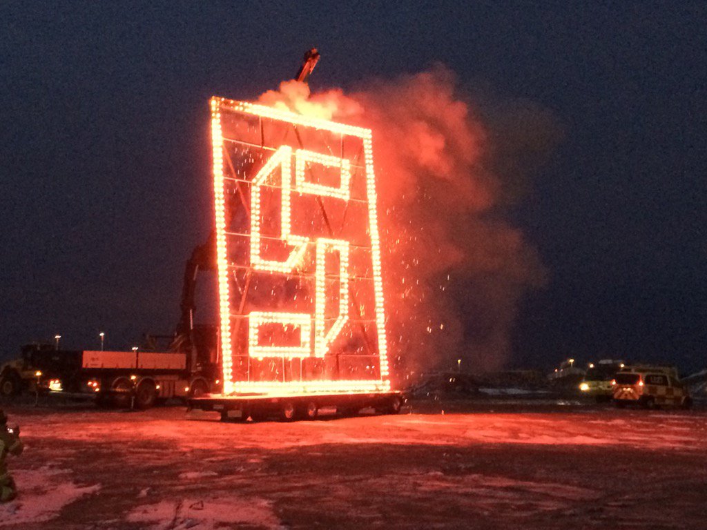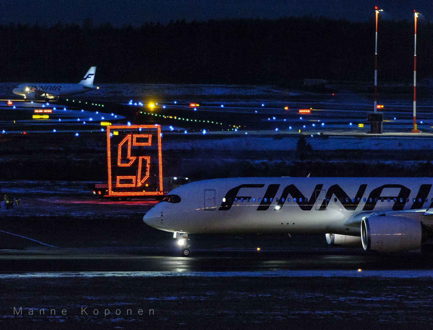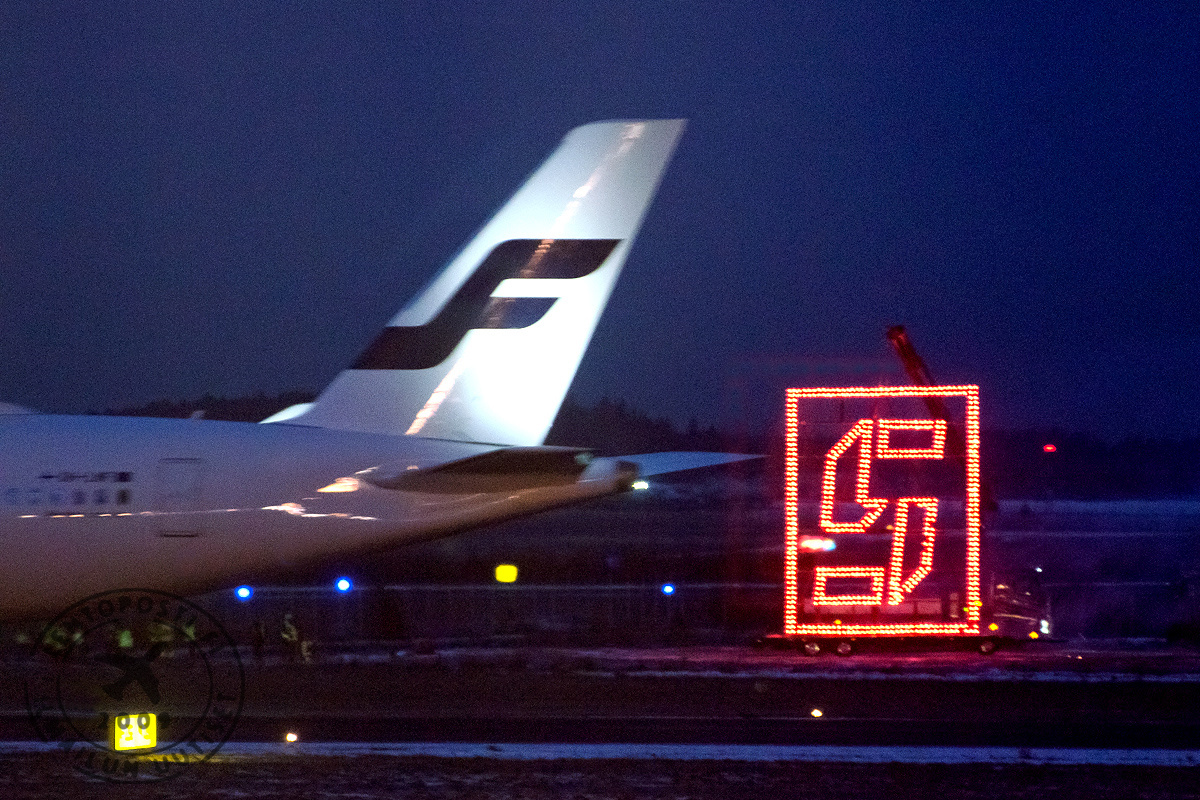 Finnairin Airbus A350-900 XWB -koneen (OH-LWF) laskeutuessa Helsinki-Vantaan kiitotielle 22L noin kymmenen metriä korkea logo sytytettiin. Se loisti punahehkuisena iltahämyssä kun kone meni laskukiidossa ohi. HSTV lähetti soihdun sytyttämisen ja lennon AY4512 laskeutumisen kello 16.12 suorana lähetyksenä internetissä. Videolähetyksessä tulinen logo ei tosin ollut yhtä näyttävä kuin tapahtumasta otetuissa kuvissa, joissa illan pimeneminen välittyy paremmin.