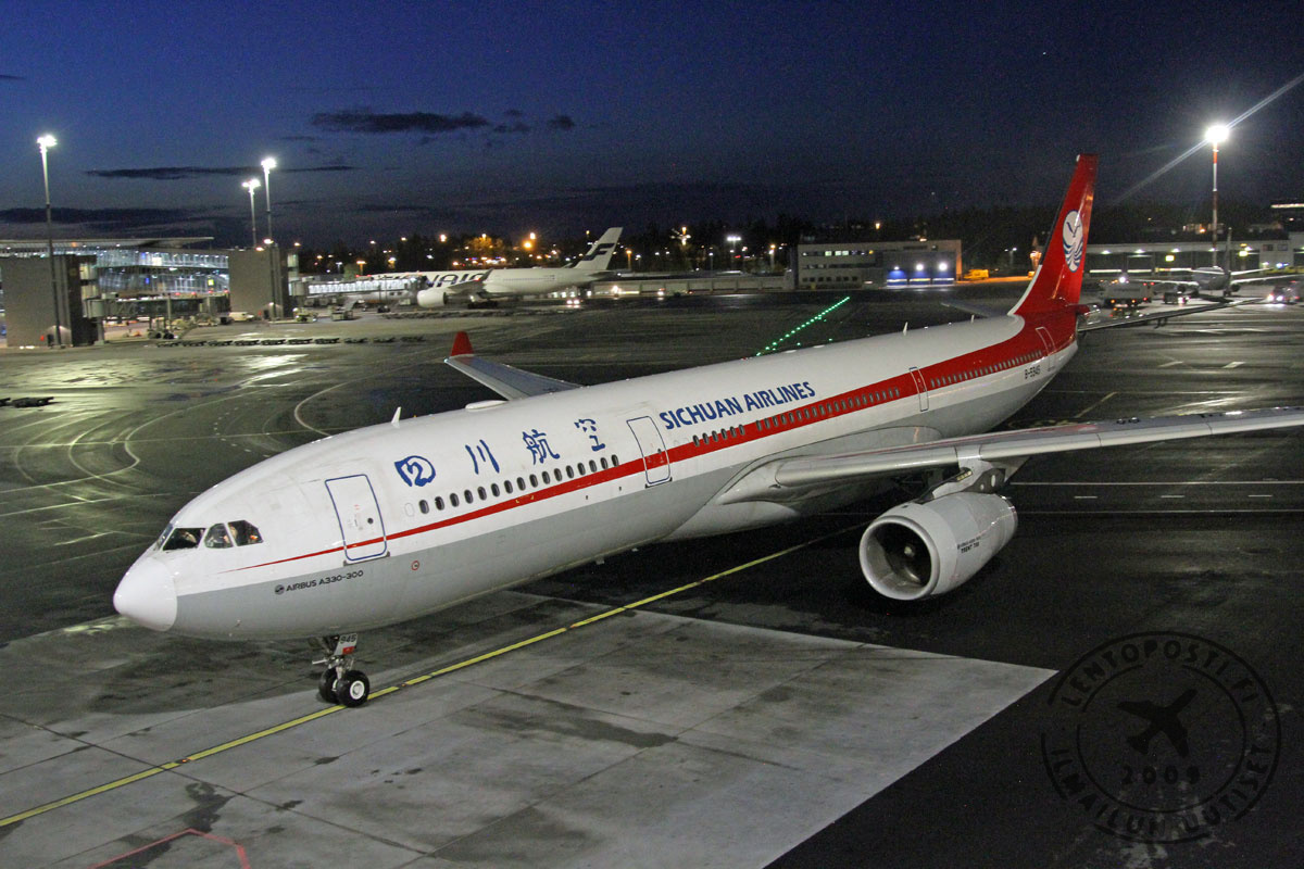 Sichuan Airlines lentää reittiä Helsinki-Vantaalle Airbus A330-300 -koneella, jossa on kaikkiaan 290 matkustajapaikkaa kahdessa luokassa. Business-luokassa paikkoja on 34 ja economy-luokassa 256.